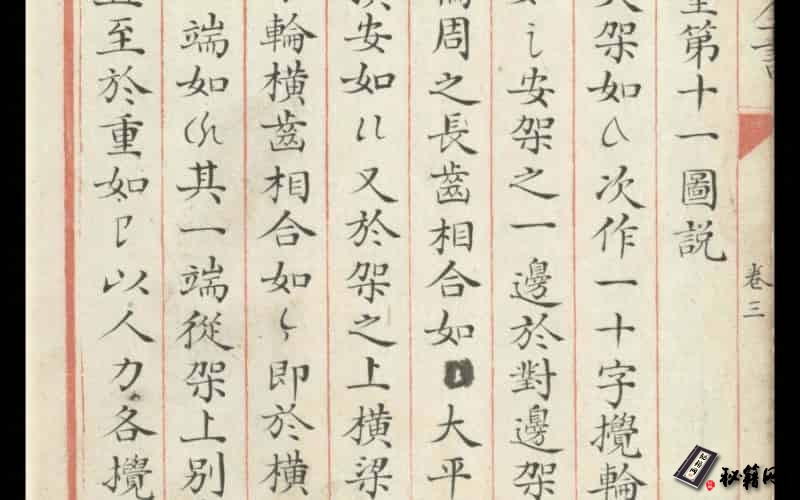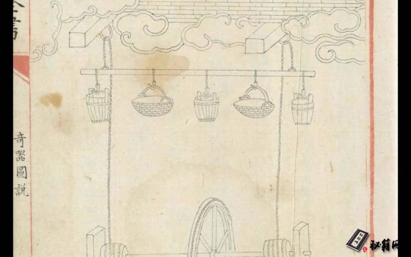 第三卷为机械原理应用,共绘有54幅图,包括起重、引重、转重、取水、转磨等,每幅图后均有说明;