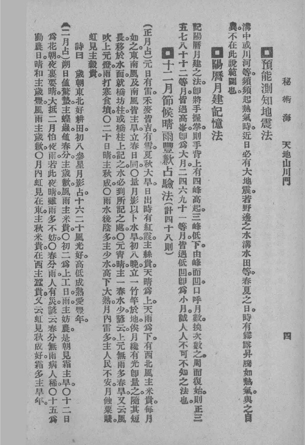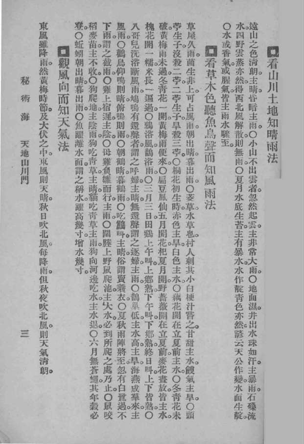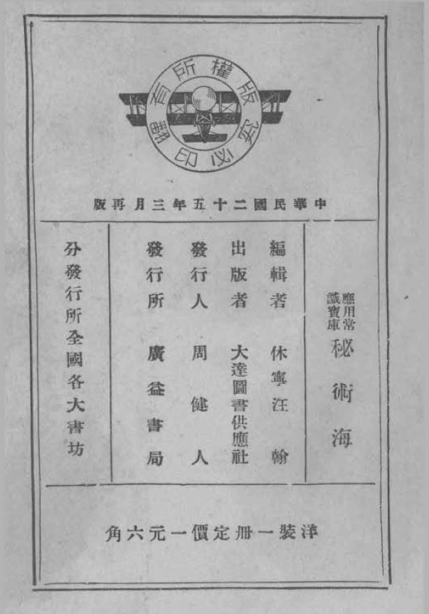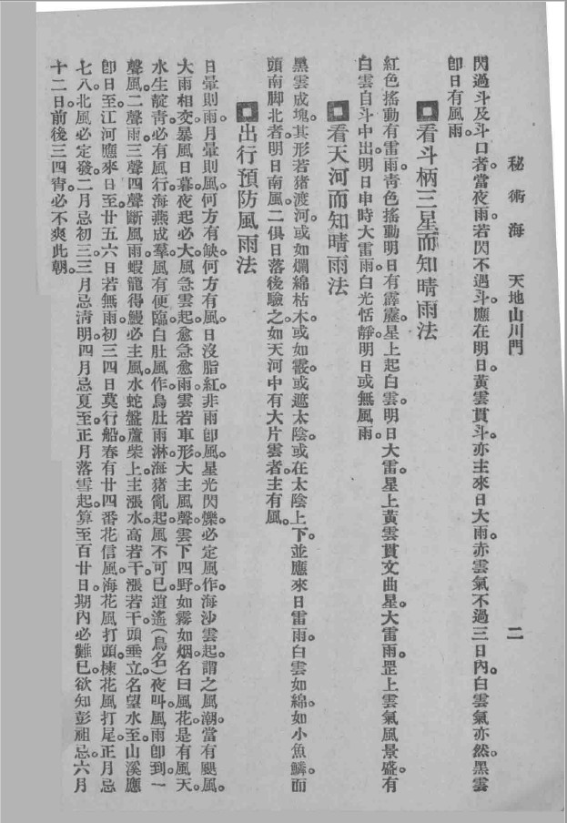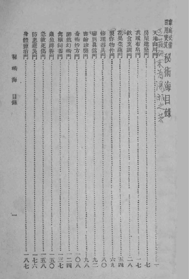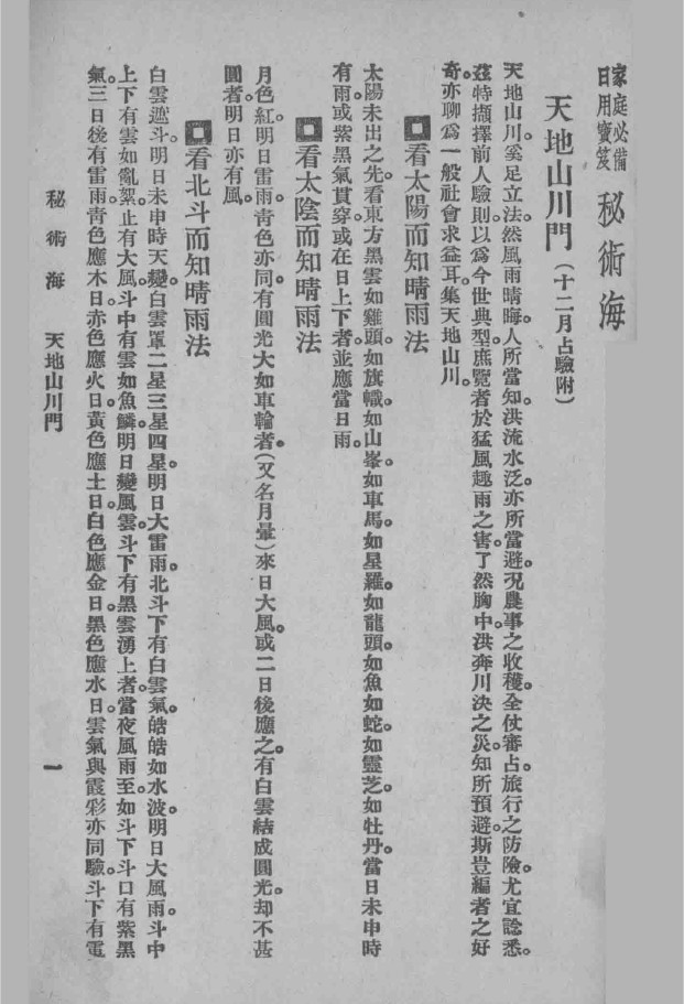 此书又名《家庭宝鉴日用秘笈秘术海》,是以民国《通天秘书要览》为蓝本,辑《古今秘苑》、《物类相感志》等古籍百余种,收入实用秘传方术千余条,分为天地山川门、房屋建筑门等20大门类。