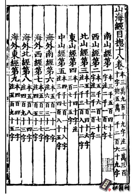 《山经》5卷为:《南山经》、《西山经》、《北山经》、《东山经》、《中山经》,又称为《五藏山经》;《海经》分为《海外经》、《海内经》、《大荒经》,每部下面又有数卷。《海外经》包括《海外南经》、《海外西经》、《海外北经》、《海外东经》4个部分;《海内经》包括《海内南经》、《海内西经》、《海内北经》、《海内东经》4个部分;《大荒经》包括《大荒东经》、《大荒南经》、《大荒西经》、《大荒北经》、《海内经》(并非前面的《海内经》)5个部分。