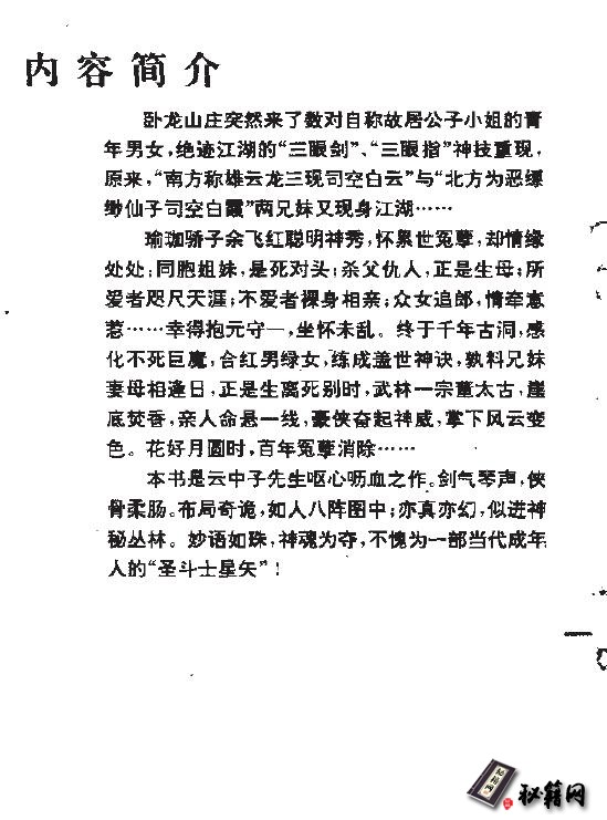 卧龙山庄突然来了数对自称故居公子小姐的青年男女,绝迹江湖的“三眼剑”、“三眼指”神技重现,原来,“南方称雄云龙三现司空白云”与“北方为恶缥缈仙子司空白霞”两兄妹又现身江湖······瑜珈骄子余飞红聪明神秀,怀累世冤孽,却情缘处处:同胞姐妹,是死对头;杀父仇人,正是生母;所爱者咫尺天涯;不爱者裸身相亲;众女追郎,情牵意惹······幸得抱元守一,坐怀未乱。终于千年古洞,感化不死巨魔,合红男绿女,练成盖世神诀,孰料兄妹妻母相逢日,正是生离死别时,武林一宗董太古,崖底焚香,亲人命悬一线,豪侠奋起神威,掌下风云变色。花好月圆时,百年冤孽消除······本书是云中子先生呕心呖血之作。剑气琴声,侠骨柔肠。布局奇诡,如人八阵图中;亦真亦幻,似进神秘丛林。妙语如珠,神魂为夺,不愧为一部当代成年人的“圣斗士星矢”!