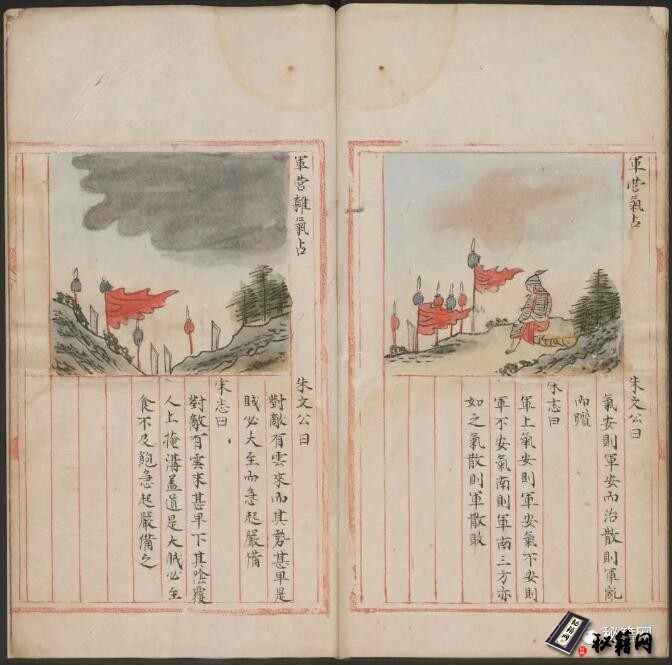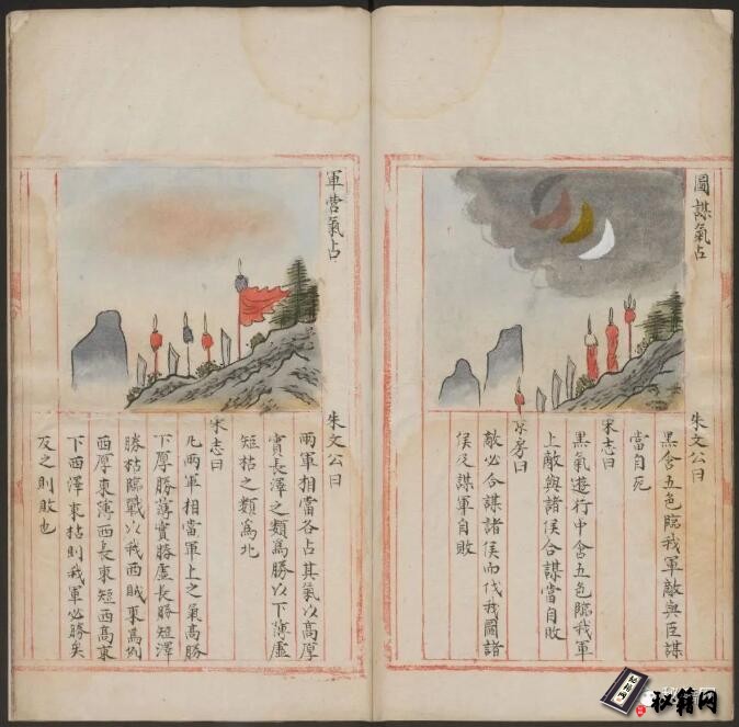 这本书可能的名字是《运气占》,可能是《军中候气说》和《云气出入三垣说》的一个合编本。它是一套通过天文气象占卜世事的书籍,有彩色配图和摘自史书的解释文字。此本为朱丝栏彩色钞本。