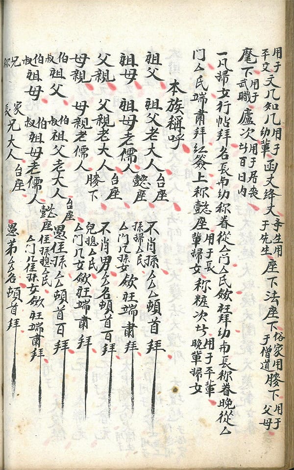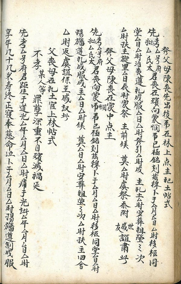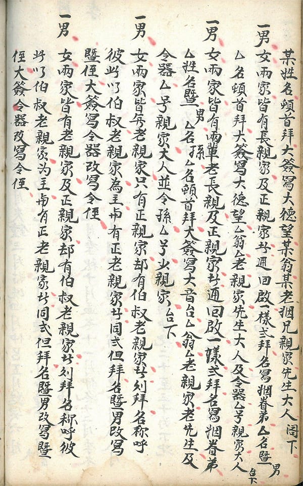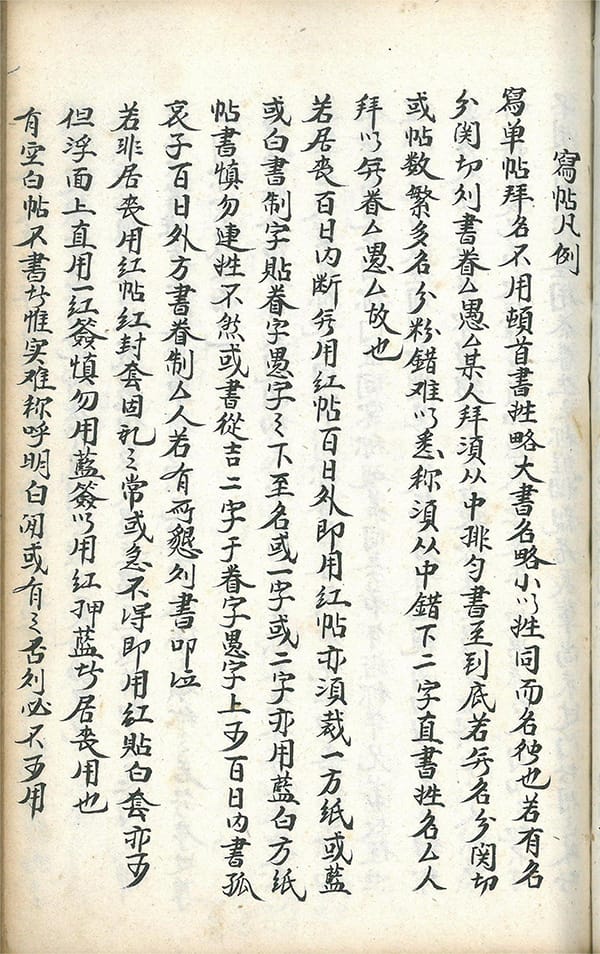 内容包括:嫁娶周堂图,论婚姻犯相歌,红沙日不宜嫁娶,嫁娶宜避,二十八宿上任歌,吉时详註,娶送女客三相人不用歌,喜神方位歌,起吉时歌,笺文凡例,男家通启笺文,女家通启笺文,报丧帖讲义,报丧帖式,发父母陈丧在家中点主,父丧母在礼土官上林帖式,父死已塟后日母死合葬帖,父死寄埋后日母死同出合葬帖,父与初母俱属寄埋后继母死先合葬又在新亦上发丧帖,母死寄埋后父死合葬母不往家起帖式,父母阵丧先合葬后候客帖式,有翁有夫有子帖式,丧妻帖式,写帖凡例,妇女行帖红签上大称呼,本族称呼,学生请先生全帖,先生请学生全帖,祝女寿帖式,丧及仪节,新丧成服文,陈丧成服文,祖母丧成服文,父母同丧堂祭文,祖道文,下葬祭墓文,重修关帝庙碑文,祖茔谱碑序,公看义坡文,祈雨文,贺病愈文,祈安泰文,太山进儿女文,布施书头文,许愿未还文,疾病还愿文,过继合同文,弟过兄子继单文,觅仆人文契,分义子文,分单文约,换契书文,租地合同文,拜交文,结亲文,九宫合婚图等。