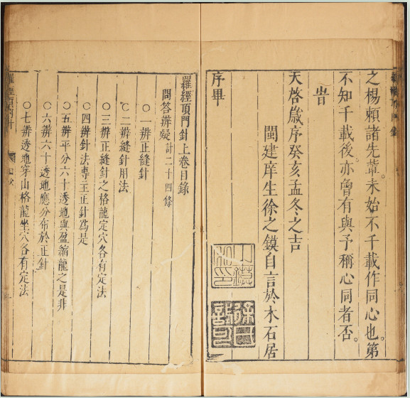 《新镌徐氏家藏罗经顶门针》,被收录于子部珍本备要第54种,明徐之镆撰,朱之相图解,三乐斋藏板,天启时期金陵书林唐鲤耀刊本。