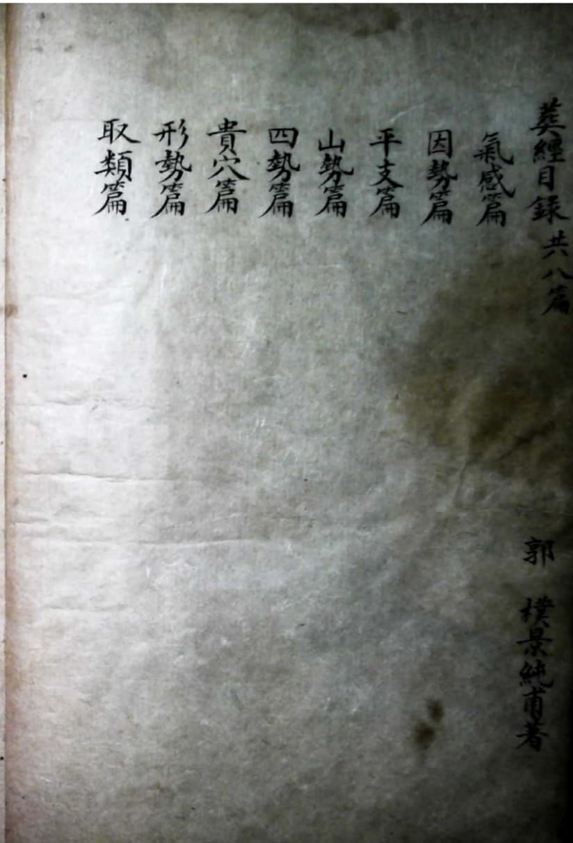 内容包括,《葬经》:气势篇,因势篇,平支篇,山势篇,四势篇,贵穴篇,形式篇,取类篇。