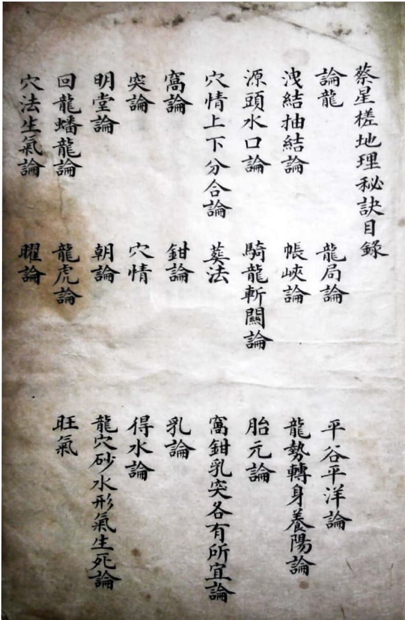 《 蔡星槎地理秘诀》:论龙,龙局论,平谷平洋论,洩结抽结论,帐峡论,龙势转身养阳论,源头水口论,骑龙斩关论,胎元论,穴情上下分合论,葬法,寓钳乳突各有所宜论,窝论,钳论,乳论,突论,穴情,得水论,明堂论,朝论,龙穴砂水形气生死论,回龙蟠龙论,龙虎论,旺气,穴法生气论,曜论。