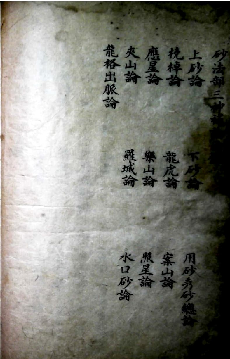 《砂法部三神补论》:上砂论,下砂论,用砂秀砂总论,橈桌论,龙虎论,案山论,应星论,乐山论,照星论,夹山论,罗城论,水口砂论,龙格出脉论。