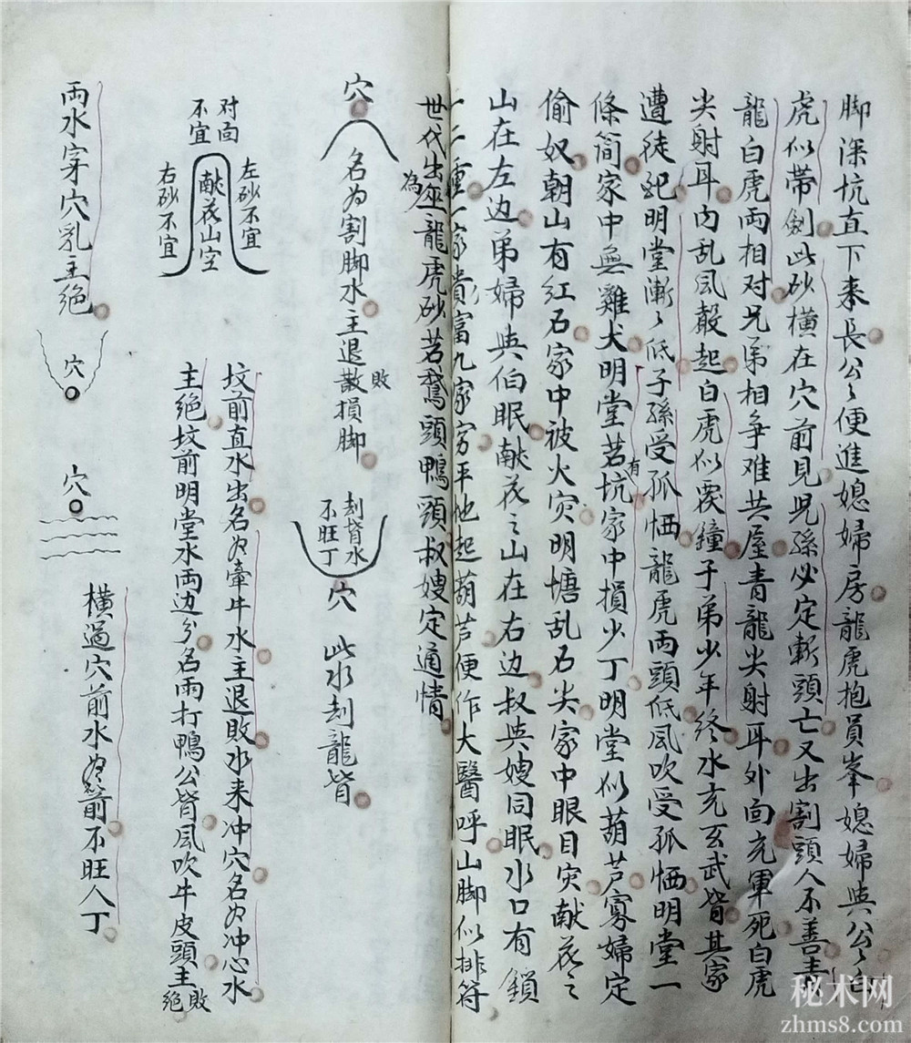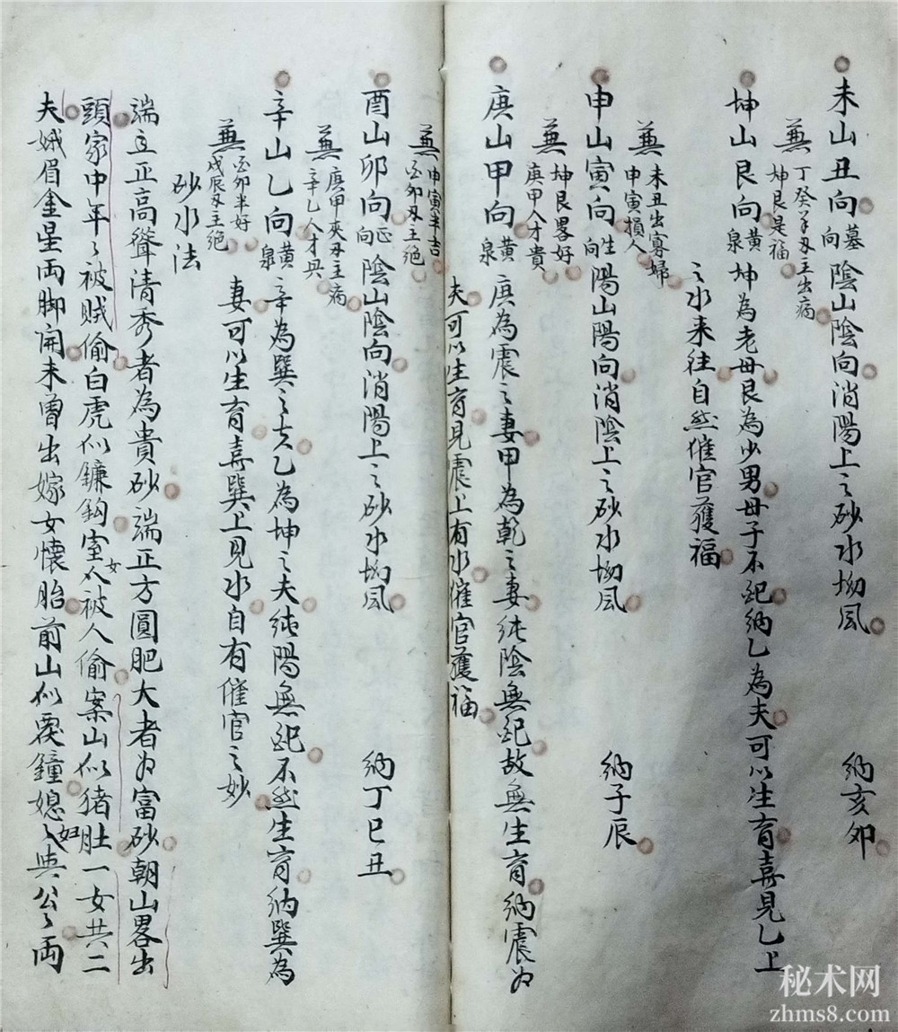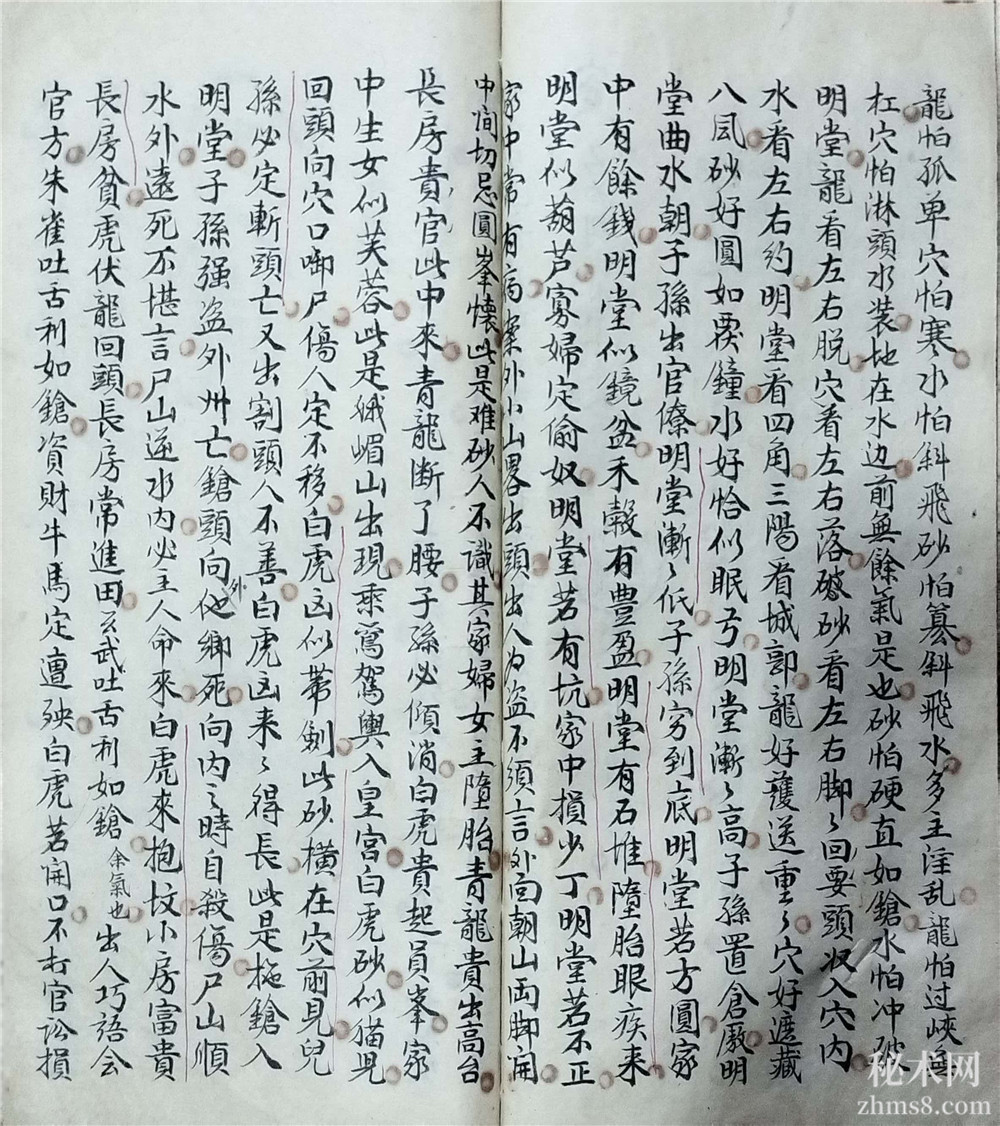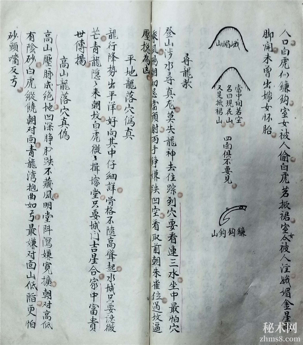 龙怕孤单穴怕寒,水怕斜飞砂怕篡,斜飞水,多主yin乱,龙怕过峡无杠,穴怕淋头水装,地在水边,前无餘气是也,砂怕硬直如枪,水怕冲破明堂,龙看左右脱,穴看左右落,破砂看左右脚,回要头壮入穴内,水看左右约,明堂看四角,三阳看城郭,龙好护送重,穴好遮藏八凤,砂好圆如覆鐘,水好恰似眠弓,明堂渐高,子孙置仓廒,明堂曲水朝,子孙出官僚,明堂渐低,子孙穷到底,明堂若方圆,家中有餘钱,明堂似镜盆,禾毂有豊盈,明堂有石堆,堕胎眼疾来,明堂似葫芦,寡妇定偷奴,明堂若有坑,家中损少丁,明堂若不正,家中常有病,案外小山略出头,出人为盗不须言,外面朝山两脚开,中间切忌圆峰懐,此是难砂人不识,其家妇女主堕胎,青龙贵出高台,长房贵官此中来,青龙断了腰,子孙必倾消,白虎贵起员峰,家中生女似芙蓉,此是纸嵋山出现,乘銮驾舆入皇宫,白虎砂,似猫见,回头向穴口卸尸,伤人定不移,白虎凶似带剑,以砂横在穴前见,儿孙必定斩头亡,又出割头人不善,白虎凶来得长,此是拖枪入明堂,子孙强盗外州亡,鎗头向外他乡死,向内之时自杀伤,尸山顺水外,远死不堪言,尸山逆水内,必主人命来,白虎来抱坟,小房富贵长房贫,虎伏龙回头,长房常进田,玄武吐舌利如鎗(余气也),出入巧语会官方,朱雀吐舌利如鎗,资财牛马定遭殃,白虎若开口,不大官讼损人口,白虎似镰钩,室女被人偷,白虎若掀裙,室女被人yin,峨媚金星两脚开,未曾出嫁女怀胎。