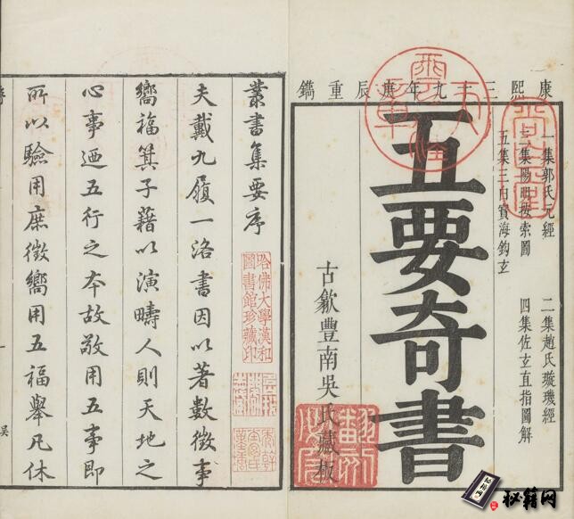 《五要奇书》是明代江之栋编辑的风水丛书,内收录郭璞元经、赵载璇玑经,阴阳按索图,刘伯温佐元直指图解, (元)幕讲禅师三白宝海钩玄,五本古代著名堪與典籍。此五部书籍开阔了阴阳五行八卦,择日神煞,玄官飞星,寻龙点穴等等风水内容,是学风水的必要资料。