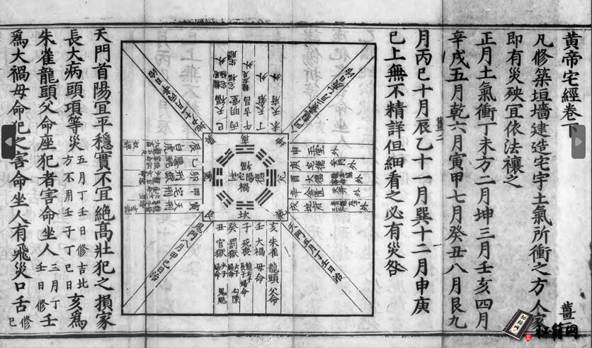 《黄帝宅经》相传黄帝所作,讲述了人与住宅的和谐,人与天地的和谐,人与自然的和谐,人与宇宙的和谐。它的学说是以太极、阴阳、三才、四象、五行、六神、七政、八卦理论为主,强调“宅以形势为身体,以泉水为血脉,以土地为皮肉,以草木为毛发,以舍屋为衣服,以门户为冠带,若得如斯,是事严雅,乃为上吉”,是中国传统文化的经典。