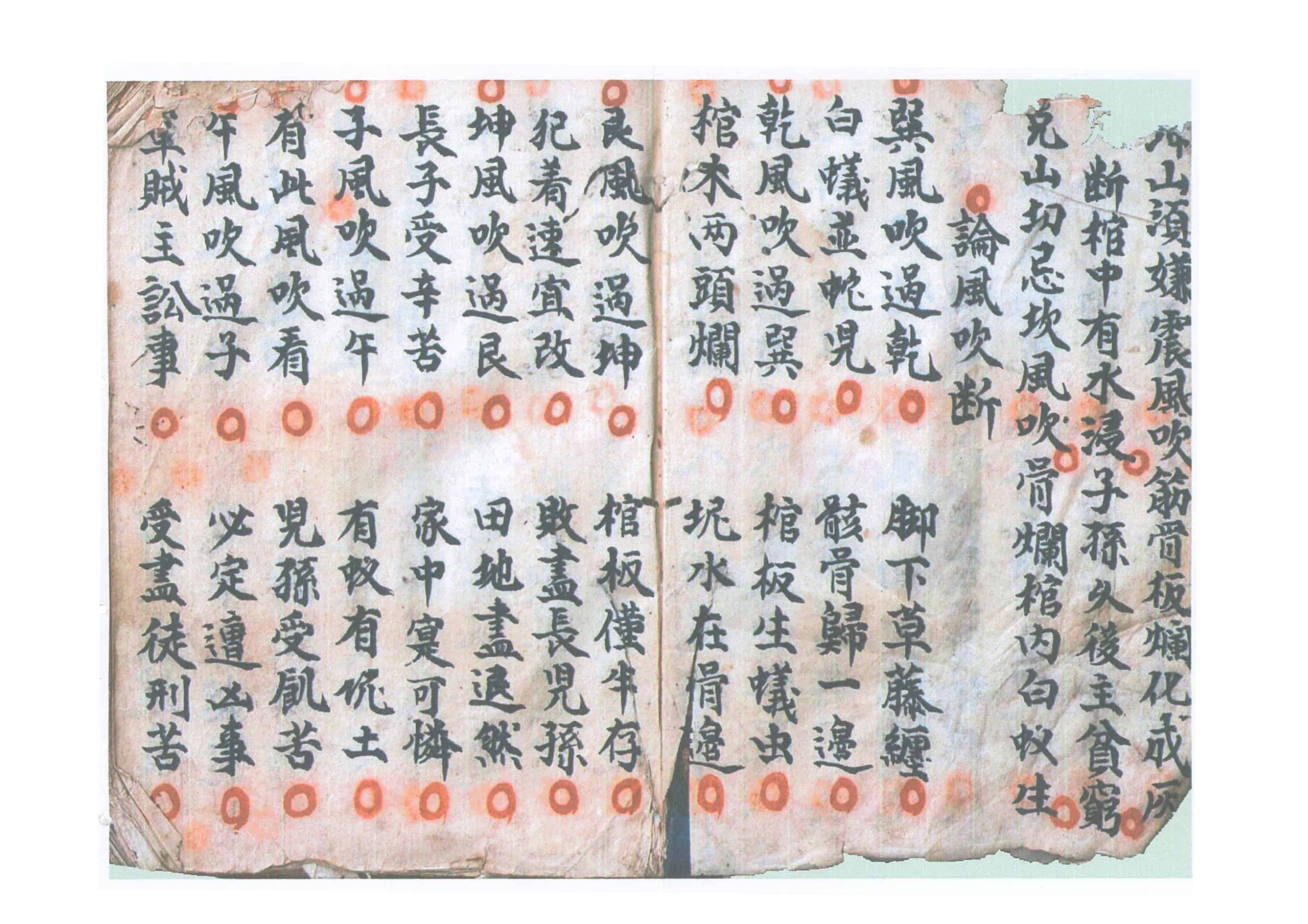 巽风吹过乾,脚下草藤缠,白蚁并蛇见,骸骨归一边,乾风吹遇巽,棺板生蚁虫,棺木两头烂,坭水在骨边,艮风吹遇坤,棺板仅半存,犯者速宜改,败尽长儿孙,坤风吹过艮,田地尽退然,长子受辛苦,家中寔可怜,子风吹过午,有蚁有泥土,有此风吹看,儿孙受饥苦,午风吹过子,必定遭凶事,军贼主讼事,受尽徒刑苦,*风吹过酉,必定火烧屋,棺内入泥水,冤牢又招G,酉风吹过卯,定断主离乡,田园无片土,儿孙受辛苦。