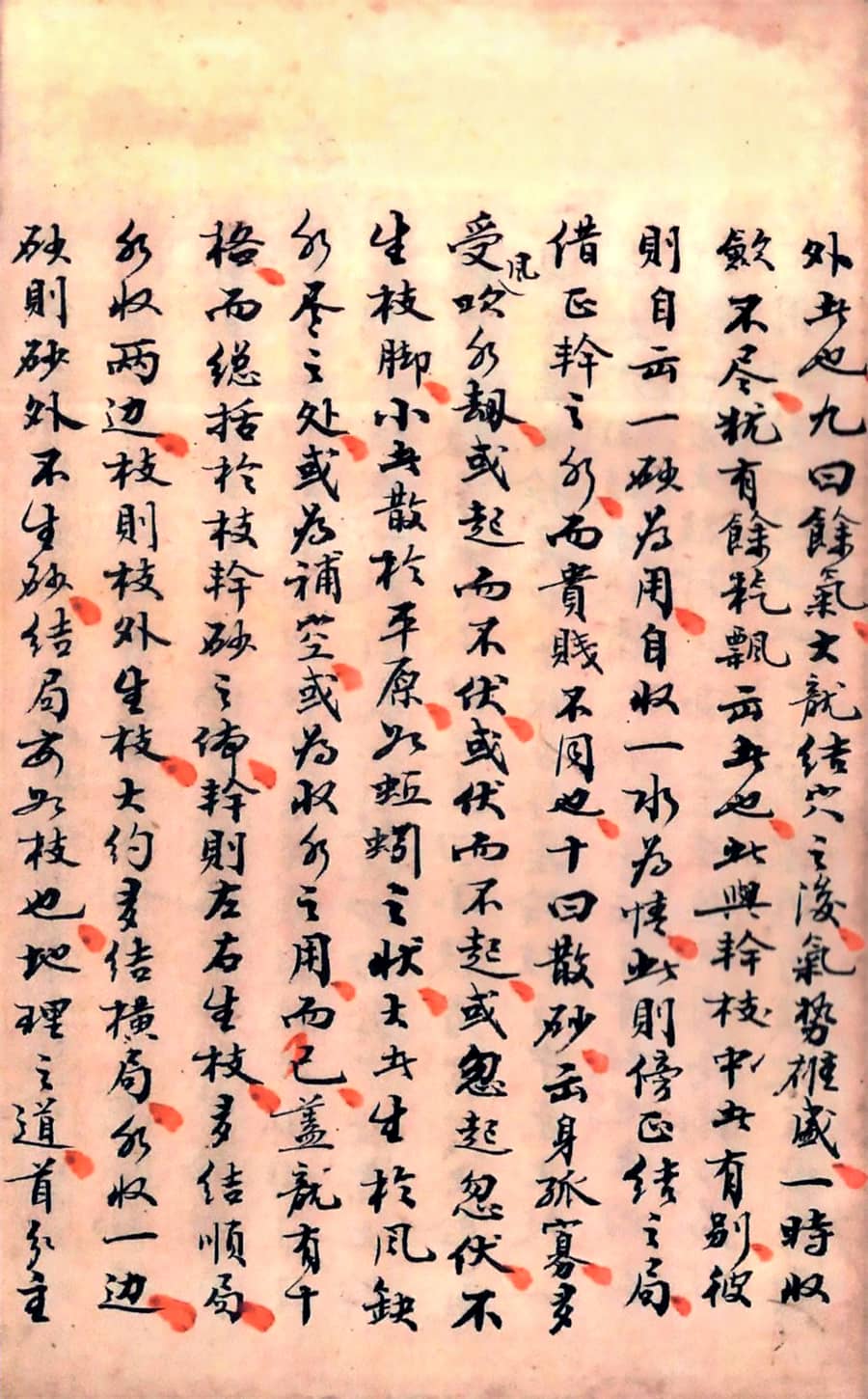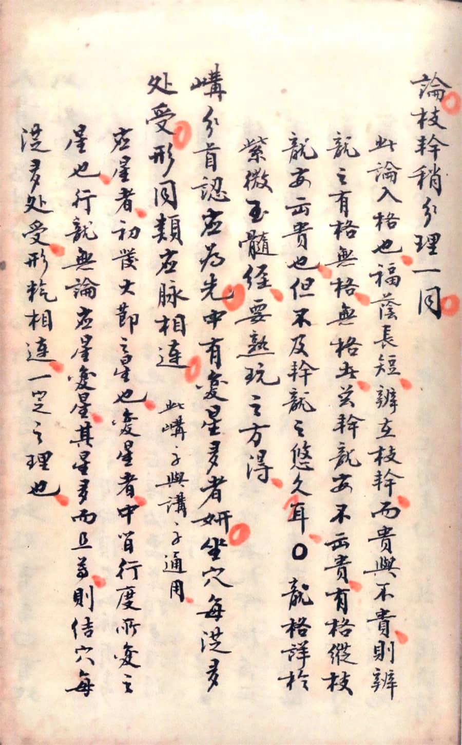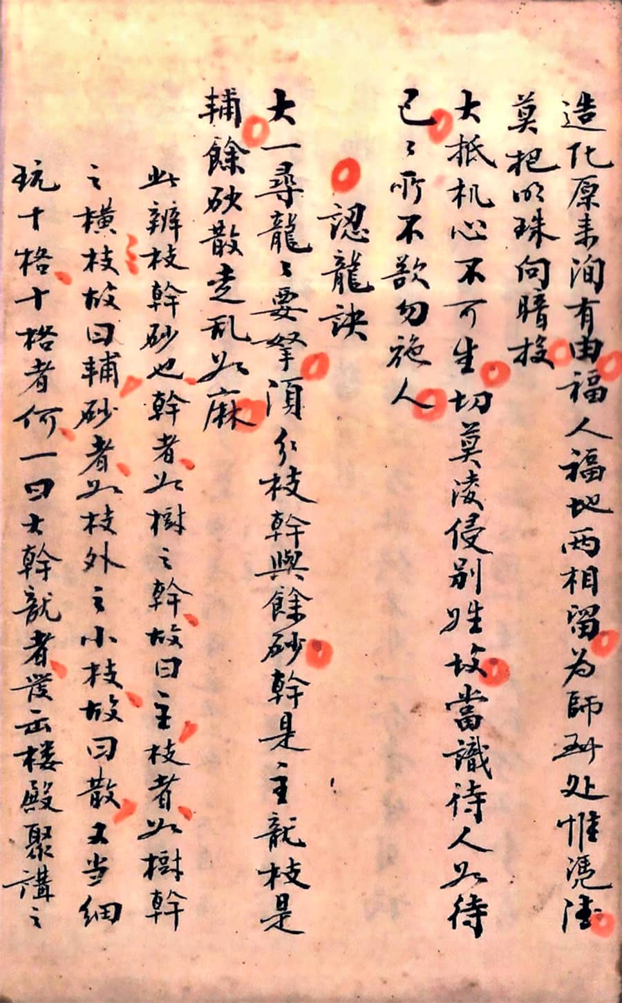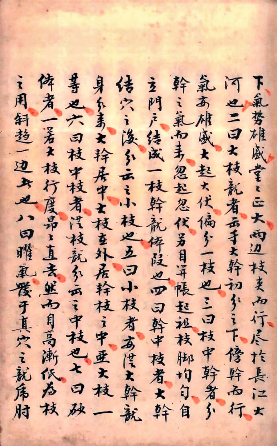 此辨枝干砂也,干者如树之干,故曰主,枝者如树干之横枝,故曰辅,砂者如枝外之小枝,故曰散,又当细玩十格,十格者何?一曰大干龙者,云于楼殿聚讲之下,气势雄盛,堂堂正大,两边枝夹而行,尽於长江大河也,二曰大枝龙者,云于大干初分之下,傍干而行,气势雄盛,大起大伏,偏分一枝也,三曰枝中干者,分干之气而来,忽起忽伏,另自并帐起祖,枝脚均匀,自立门户,结成一枝干龙体叚也,四曰干中枝者,大干结穴之后,分云之小枝也,五曰小枝者,大干身分来,大干居中,大枝在外,居干枝之中,并大枝一得也,六曰枝中枝者,枝龙分云之中枝也,七曰砂体者,一若大枝行度,昂昂直去,然而自高渐低,為枝之用,斜趋一边考也。。。