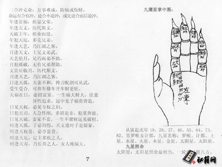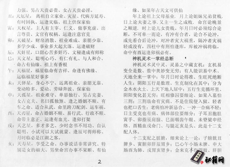 神机灵术一掌经总断神机灵术灵中灵、灵易之中藏玄机;玄机易变全是数、数中奥妙变无穷;有人能识易中术、天地全来一掌中;年月日时论得准、生旺死绝断人生;阴阳五行是数理、生克制化在其中;分为金木水火土、上天下地人居中;五行生克循环里、阴阳变化甚无穷;旺相修囚要细论、如果入墓怕三刑;三刑临命有灾病、不是住院便入狱、轻者也把口舌生;老病怕冲新忌合、一冲一合病不轻;日主受克也有病、病体部位要细分;子耳丑胞肚寅手、卯指辰肩脑、巳面咽齿午眼、未脊梁申经络、酉精血戌命门、与腿足亥是头、此是十二支配人体。