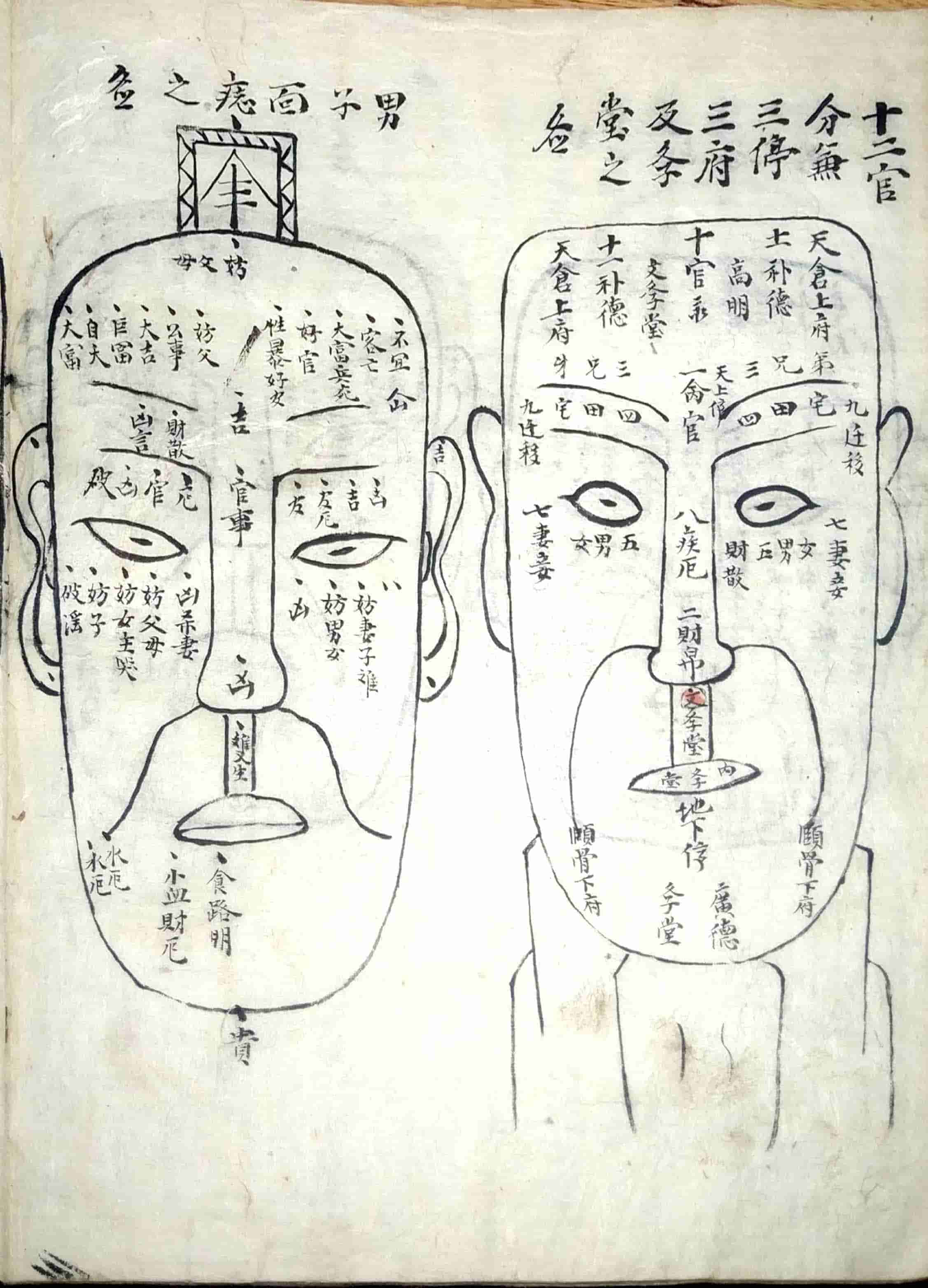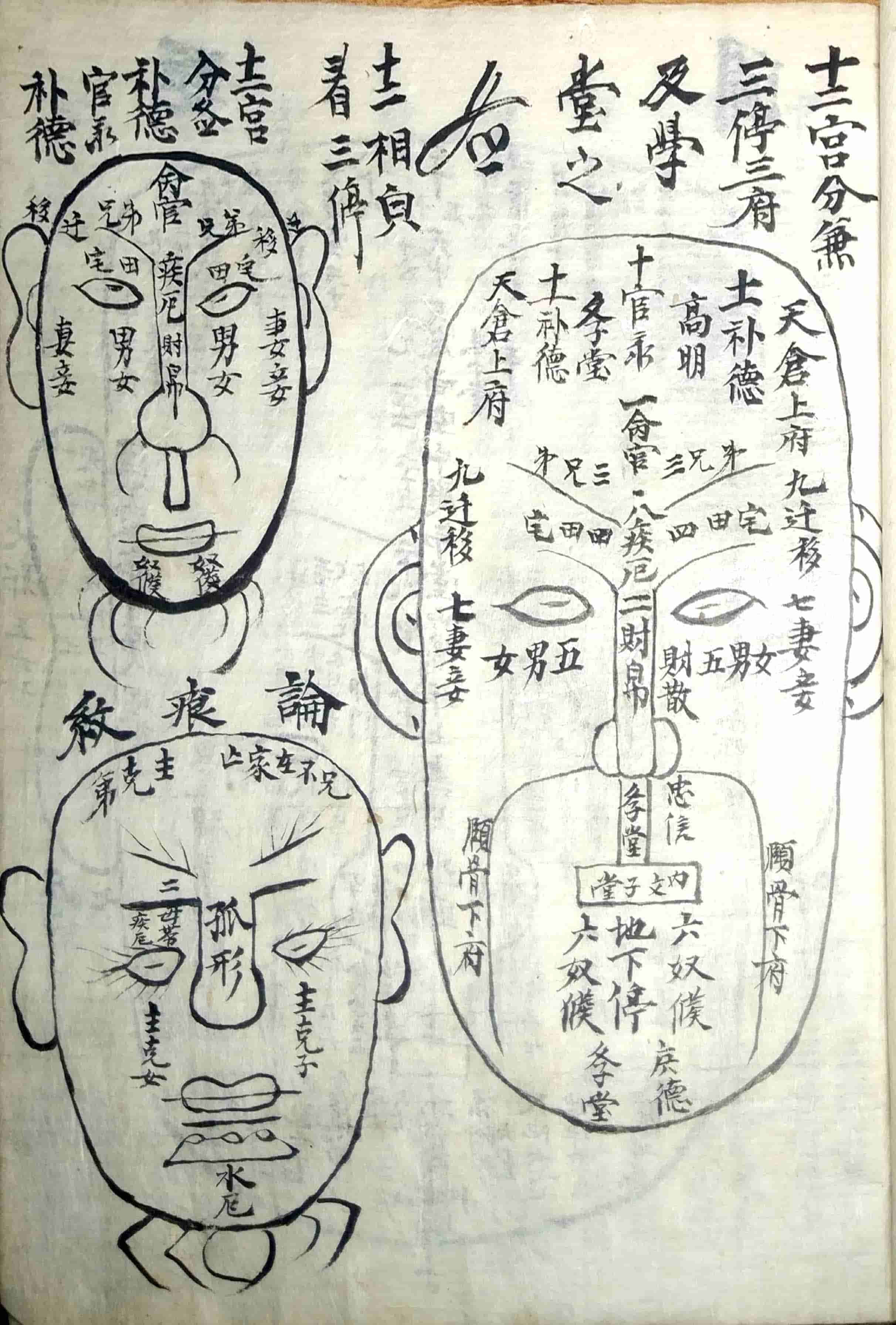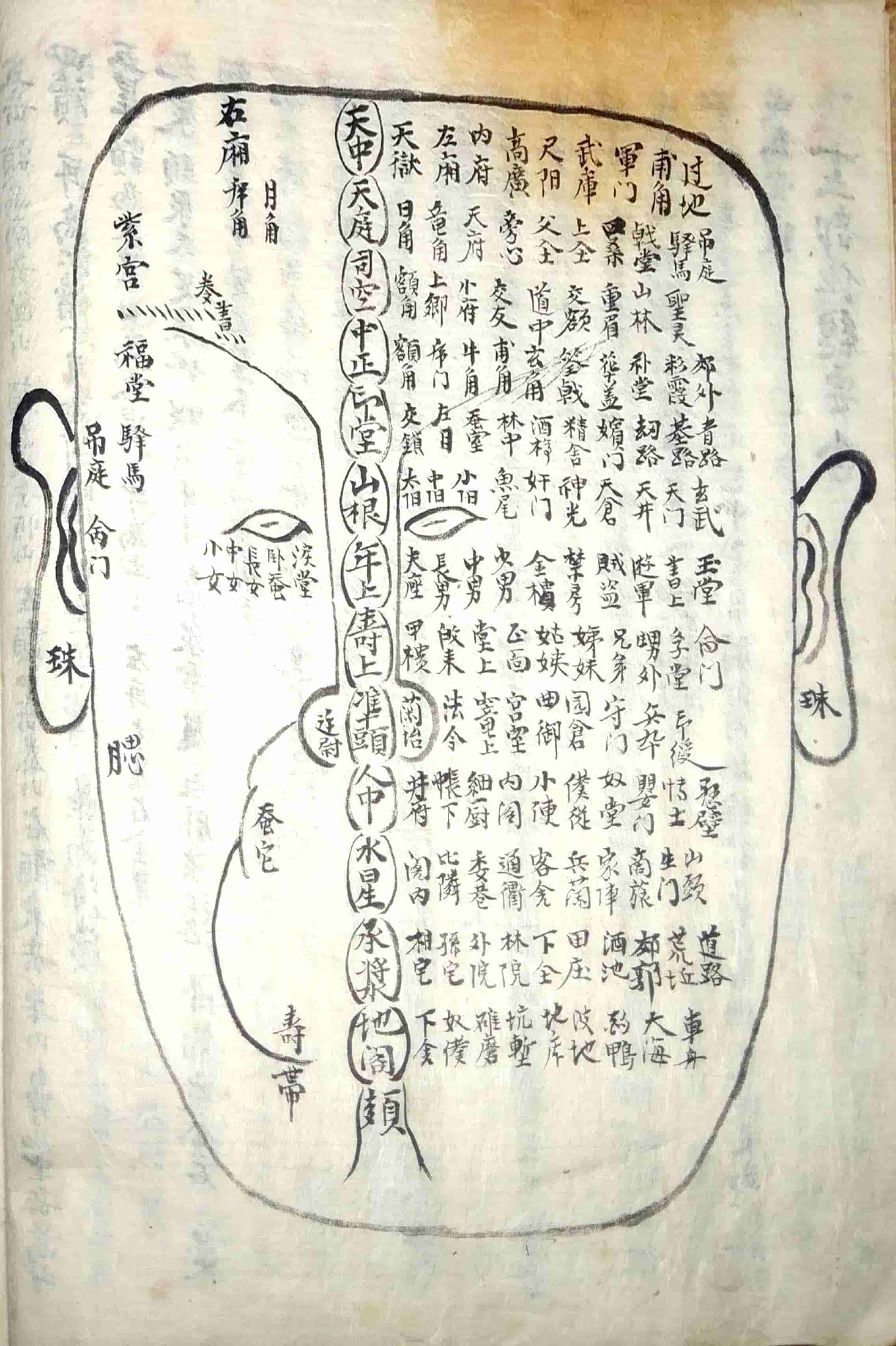 内容包括:十三部位总图歌,流年运气部,十二部位总要,论形,相骨,相肉,相头,相额,相面,相眉,相目,论鼻,论人中,论口,论唇,相舌,相齿,相耳,相四肢,相手,相足,相形气,相上停中停下停吉气,相上停中停下停凶气,论眉,论目,论耳,十二宫诀,五官总论,十一相儿看三停气色篇,妇人相𣓉经,妇人论,妇人玉管诀,论痕纹图,男人面痣之图,女人面痣图,手掌相图,三公奇文图,论掌文,相指掌,黑慧,九州八卦有色大纲图,大纲ji元图,运图,右乾坤配合法等。