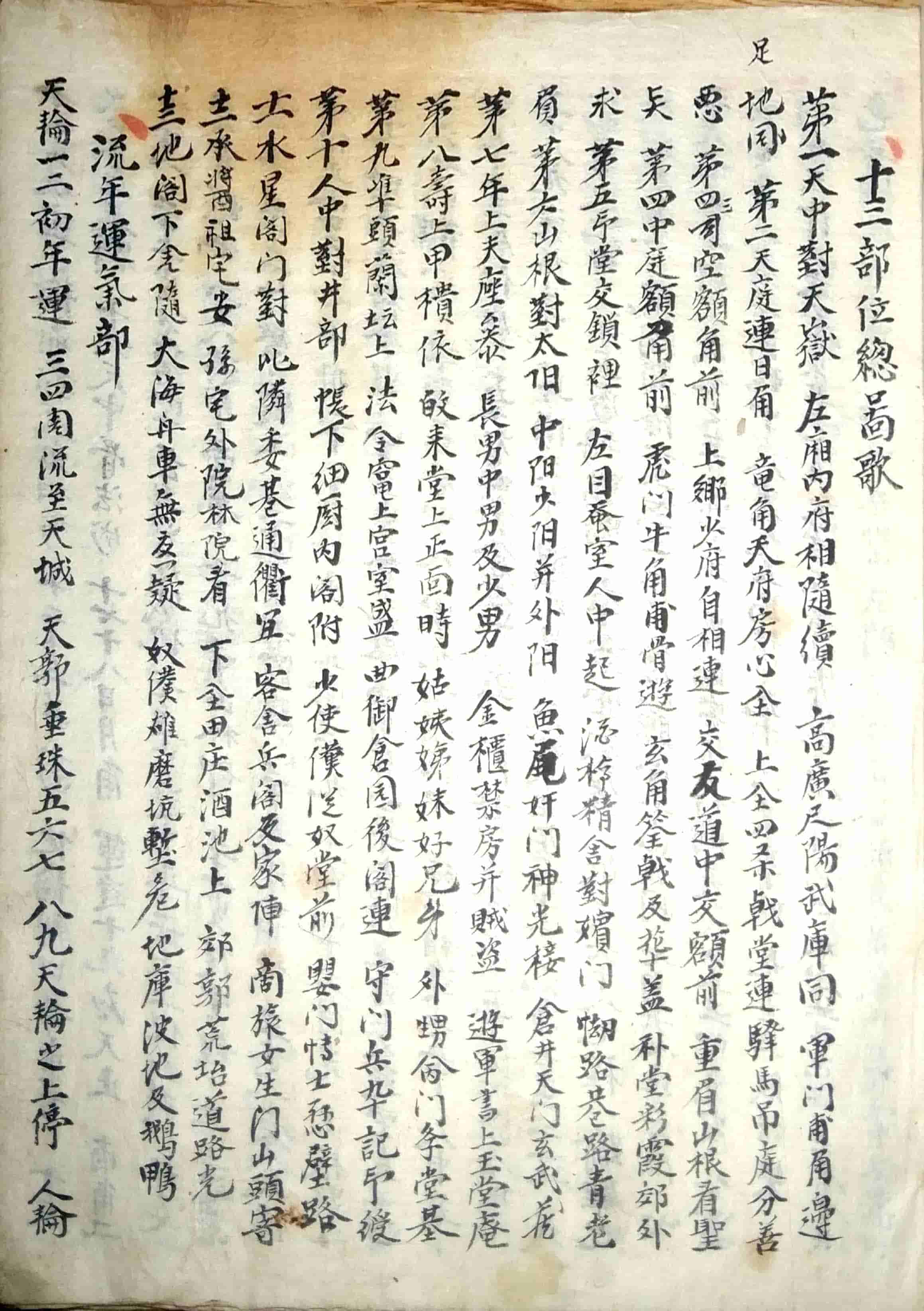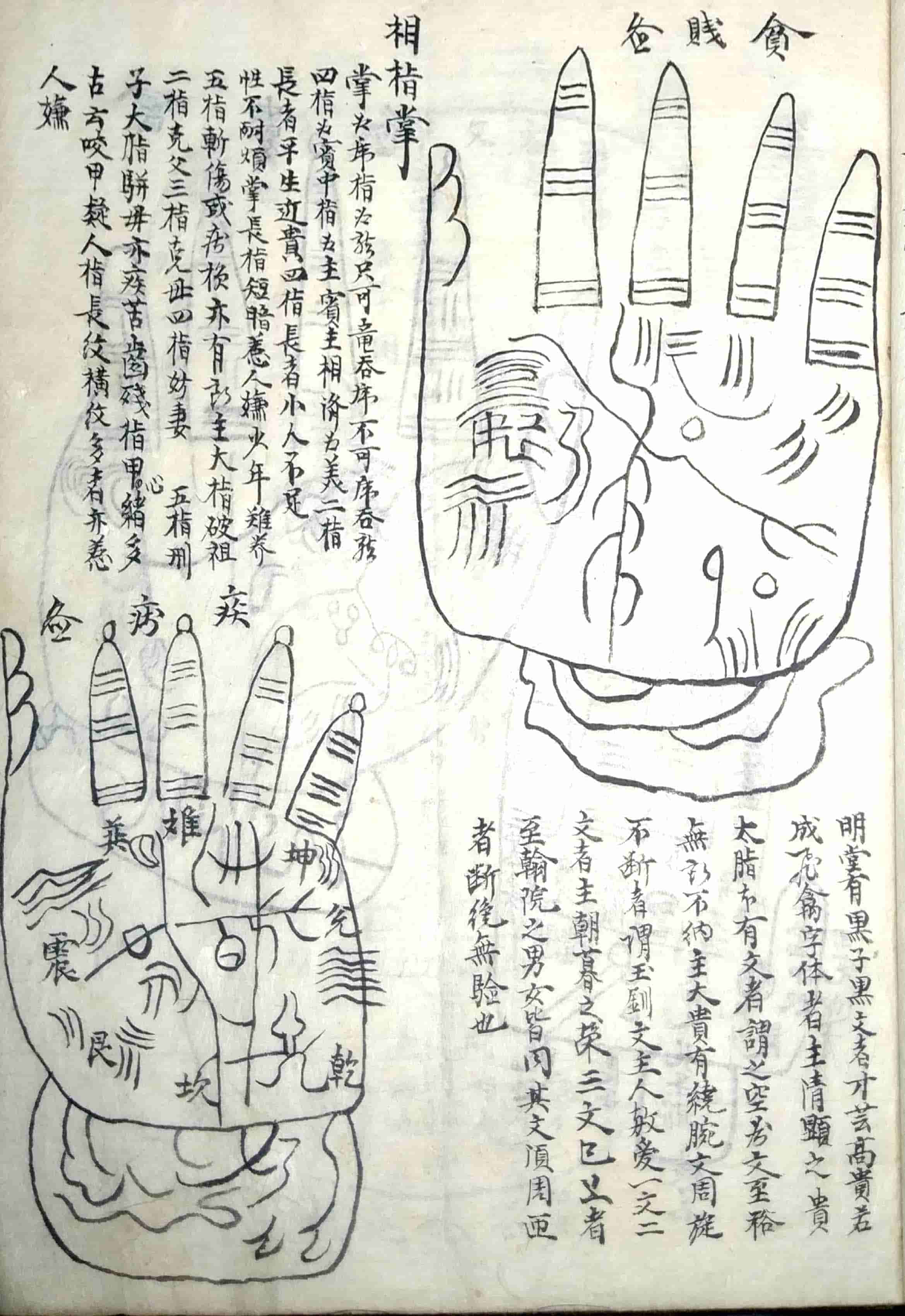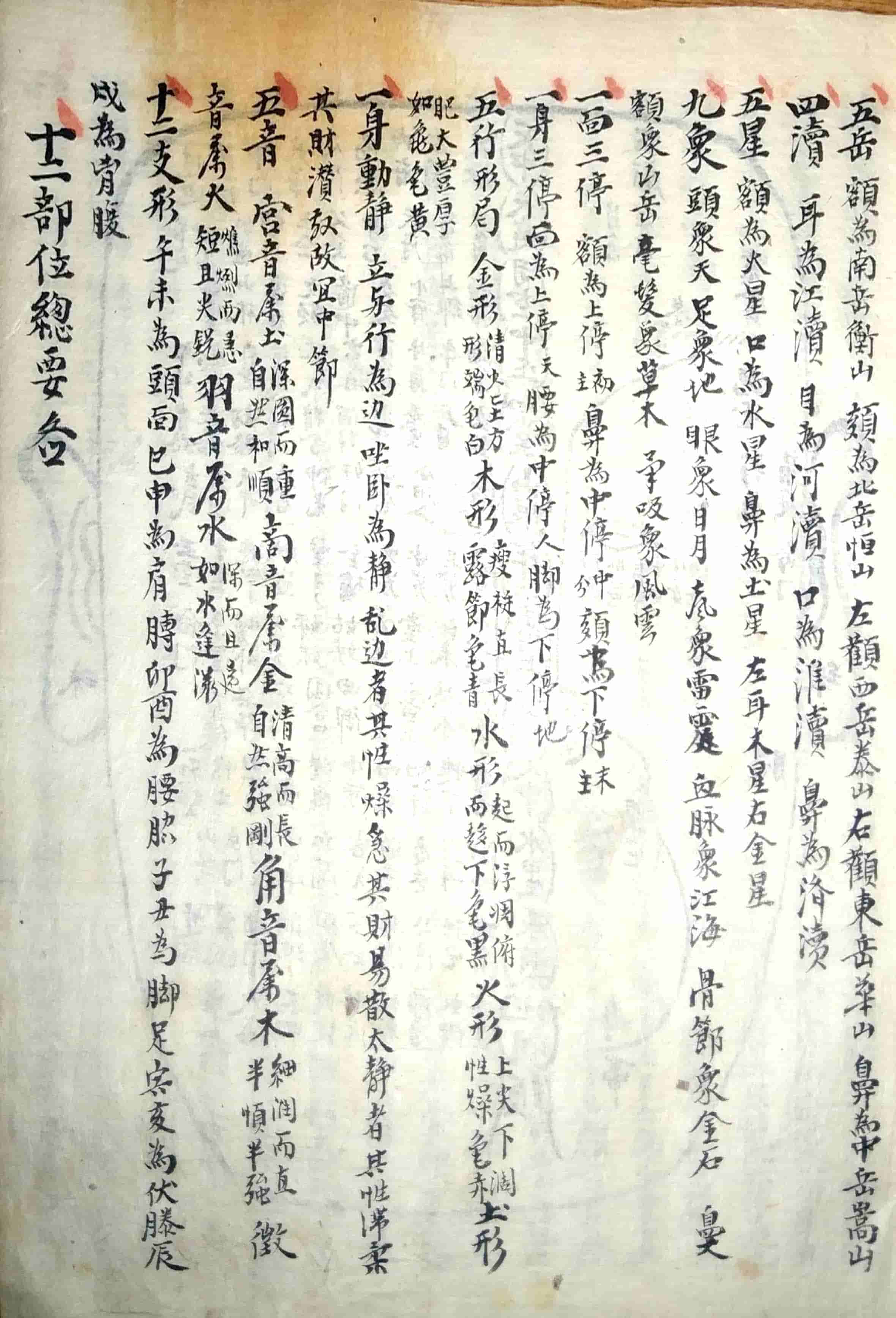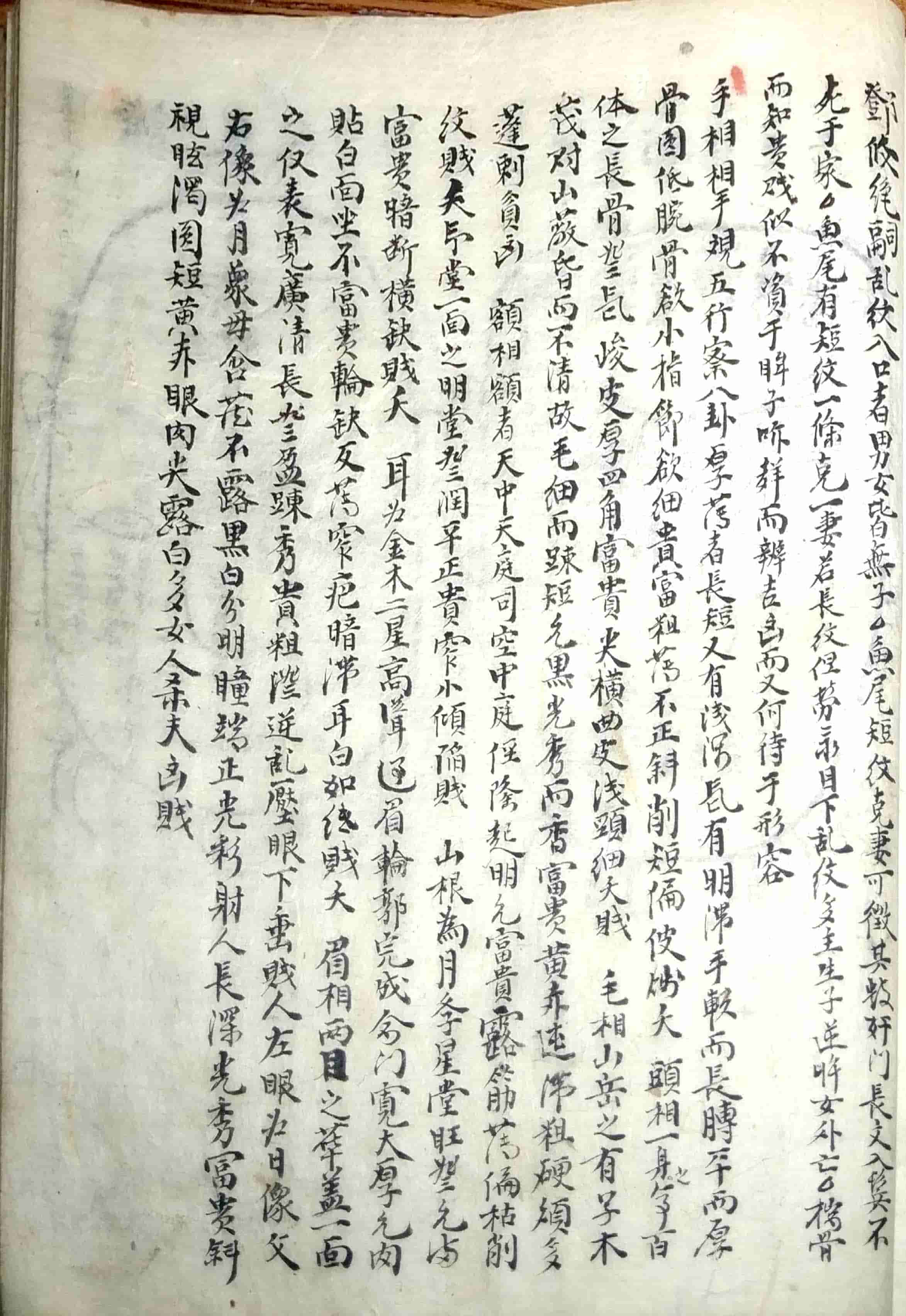 内容包括:十三部位总图歌,流年运气部,十二部位总要,论形,相骨,相肉,相头,相额,相面,相眉,相目,论鼻,论人中,论口,论唇,相舌,相齿,相耳,相四肢,相手,相足,相形气,相上停中停下停吉气,相上停中停下停凶气,论眉,论目,论耳,十二宫诀,五官总论,十一相儿看三停气色篇,妇人相𣓉经,妇人论,妇人玉管诀,论痕纹图,男人面痣之图,女人面痣图,手掌相图,三公奇文图,论掌文,相指掌,黑慧,九州八卦有色大纲图,大纲ji元图,运图,右乾坤配合法等。