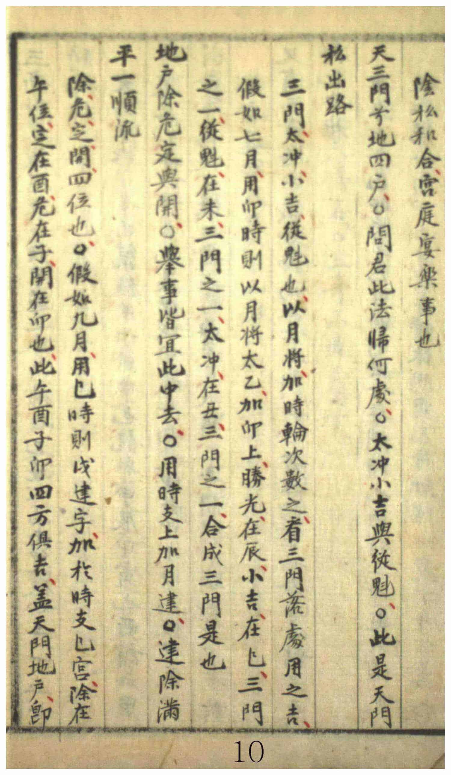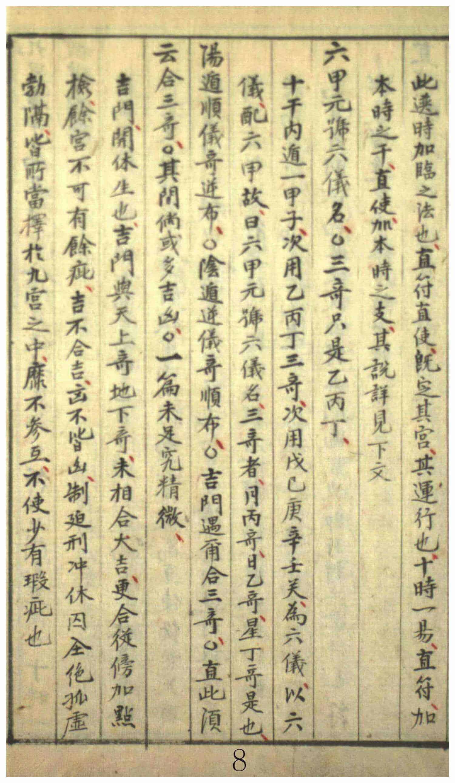 《烟奇要览》,全本178页。内容包括:烟波钓叟歌,奇门总说,遁甲起例,八门九星定位诗,分局起例捷歌,论超接之法,奇门总诀,奇门五十六格,二遁上指诀,诸格总论,奇门断验,六仪吉凶断,八门吉凶断,九星吉凶断,遁甲奇门总诀,洪范设局法,八门付法,年局布例,花奇八门图,东国二十分野图,洪奇天下图局式,天时晴雨赋,罡局气诀,罡局法,历家诀,商贾局等。
