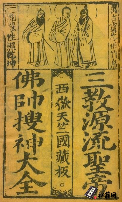 《三教源流搜神大全》,系神仙传记类著作,凡七传。撰者不详。有清末叶德辉据明刻绘图本翻刻本。叶称此书为明人以元版画像,《搜神广记》增益翻刻,而诸僧记载悉本永乐制《神僧传》一书“(《后序》)。该书搜集道、儒、释三教圣贤、世奉众神画画像计一百二十余幅,于每一幅神像后,于每一幅神像后,叙各神姓名、字号、爵里、封赠谥号,神灵事迹等,故名为《绘图三教源流搜神记大全》。书中首列儒家孔子,次老子。所灵众神,多取于小说杂记,实为宋元以来民间风俗相沿之神道记录,为研究宗教与民俗提供了重要参考书。