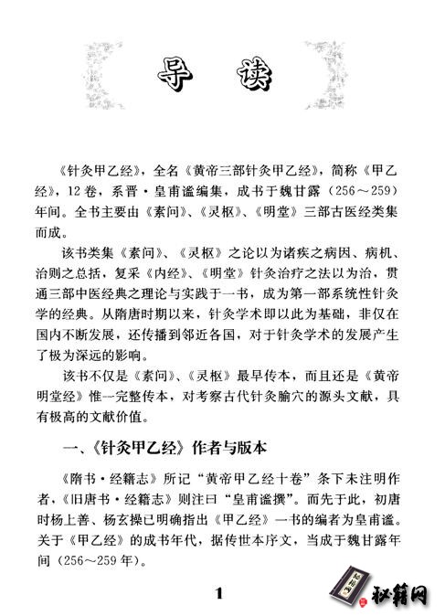 《针灸甲乙经》,全名《黄帝三部针灸甲乙经》,简称《甲乙经》,12卷,系晋·皇甫谧编集,成书于魏甘露(256~259)年间。全书主要由《素问》、《灵枢》、《明堂》三部古医经类集而成。