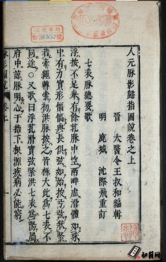本书上卷“七表脉总要歌”,论述浮、芤、滑、实、弦、紧、洪七种脉的体状和主证;“八里脉歌”论述微、沉、缓、涩、迟、伏、濡、弱八种脉的体状和主证;“九道脉歌”论述长、短、虚、促、结、代、牢、动、细九种脉的体状和主证;“奇经八脉歌”则论述阴维脉、阳维脉、阴跷脉、阳跷脉、冲脉、任脉、督脉、带脉的循行部位,体状及临床意义。