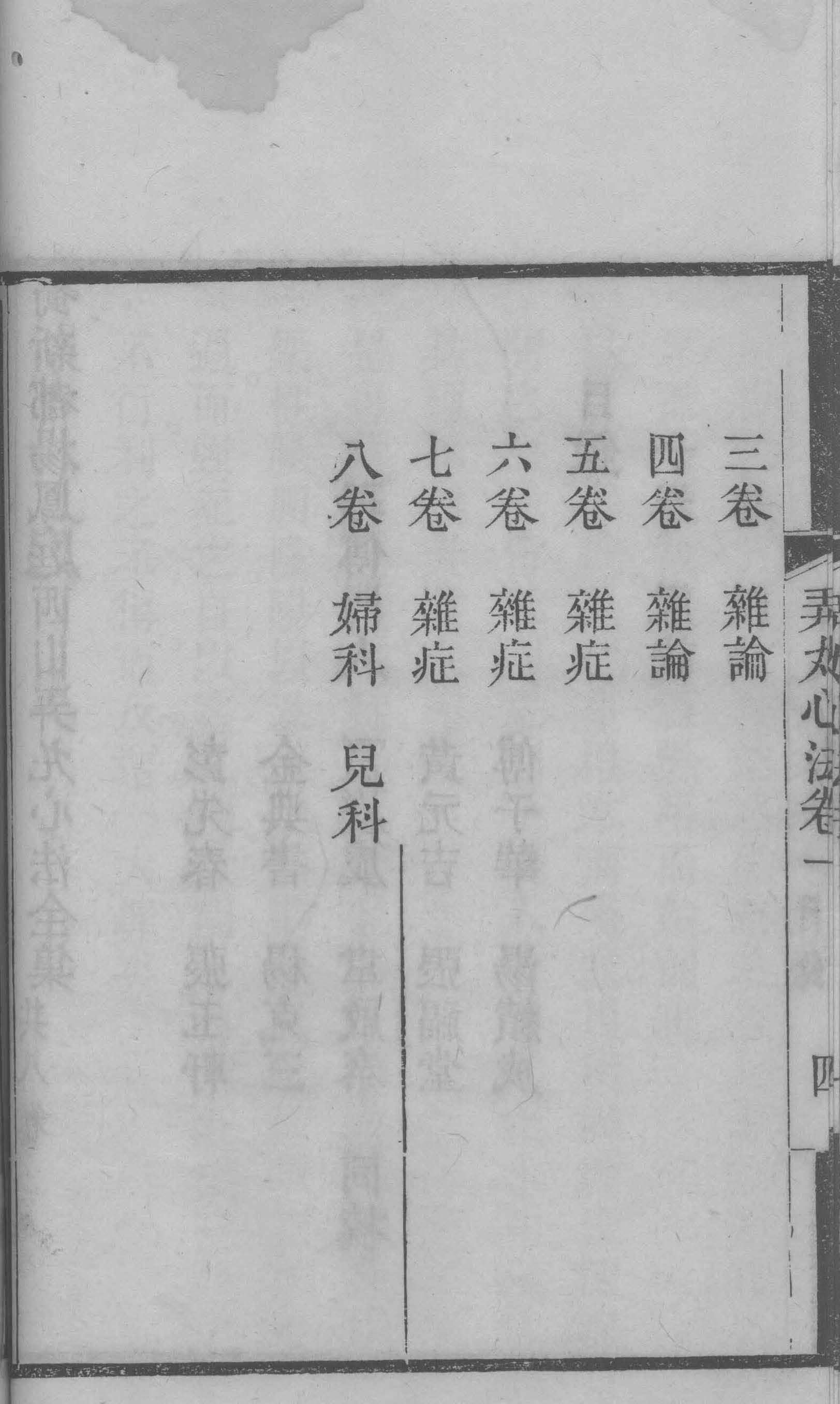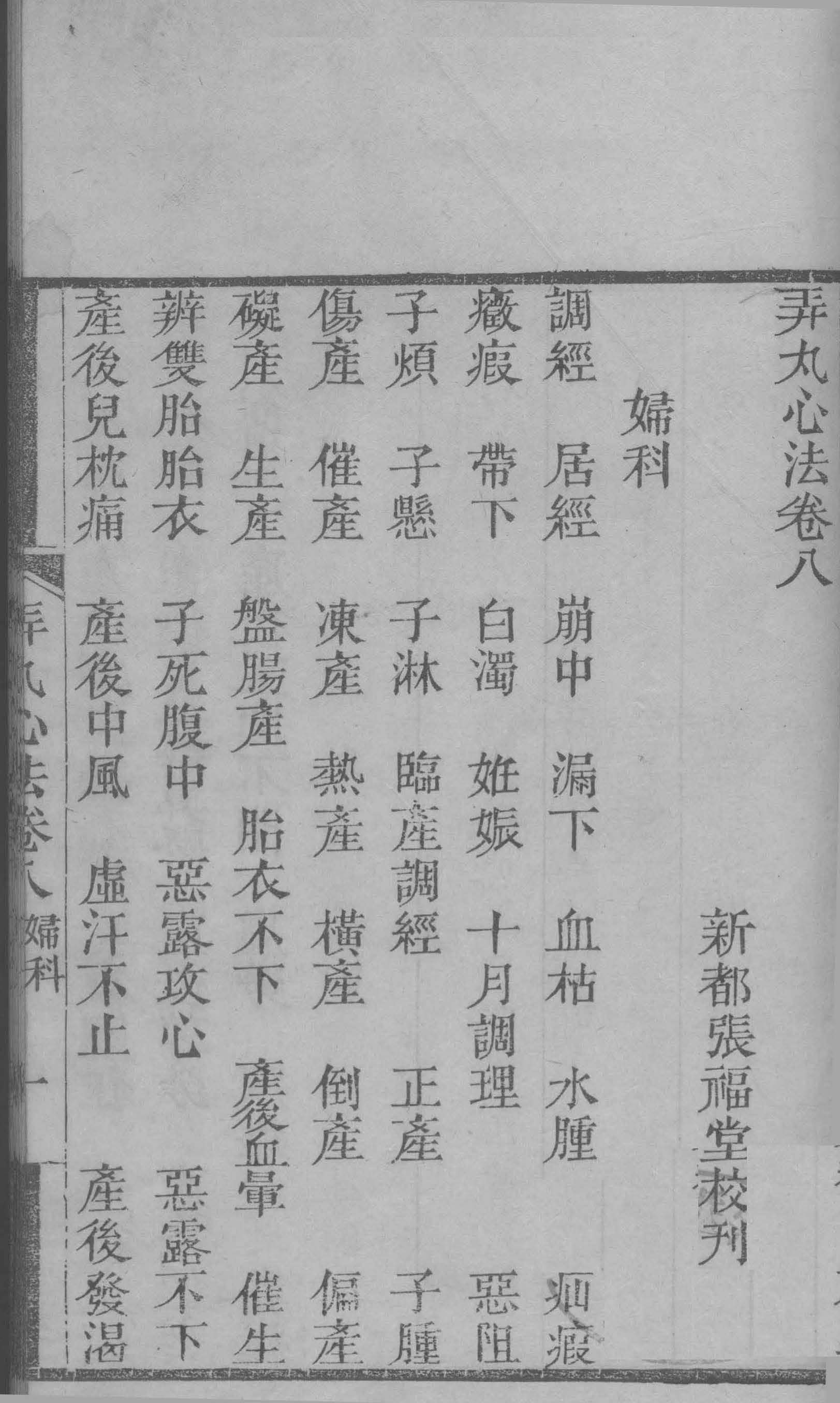 《弄丸心法》8卷,清宣统辛亥年刻本,新都张福堂校刊,卷一、卷二讨论脉诀,卷三、卷四讨论药理、药性,卷五至卷七载录内科杂证,卷八介绍妇、儿科诸病证治,全书合计815页。