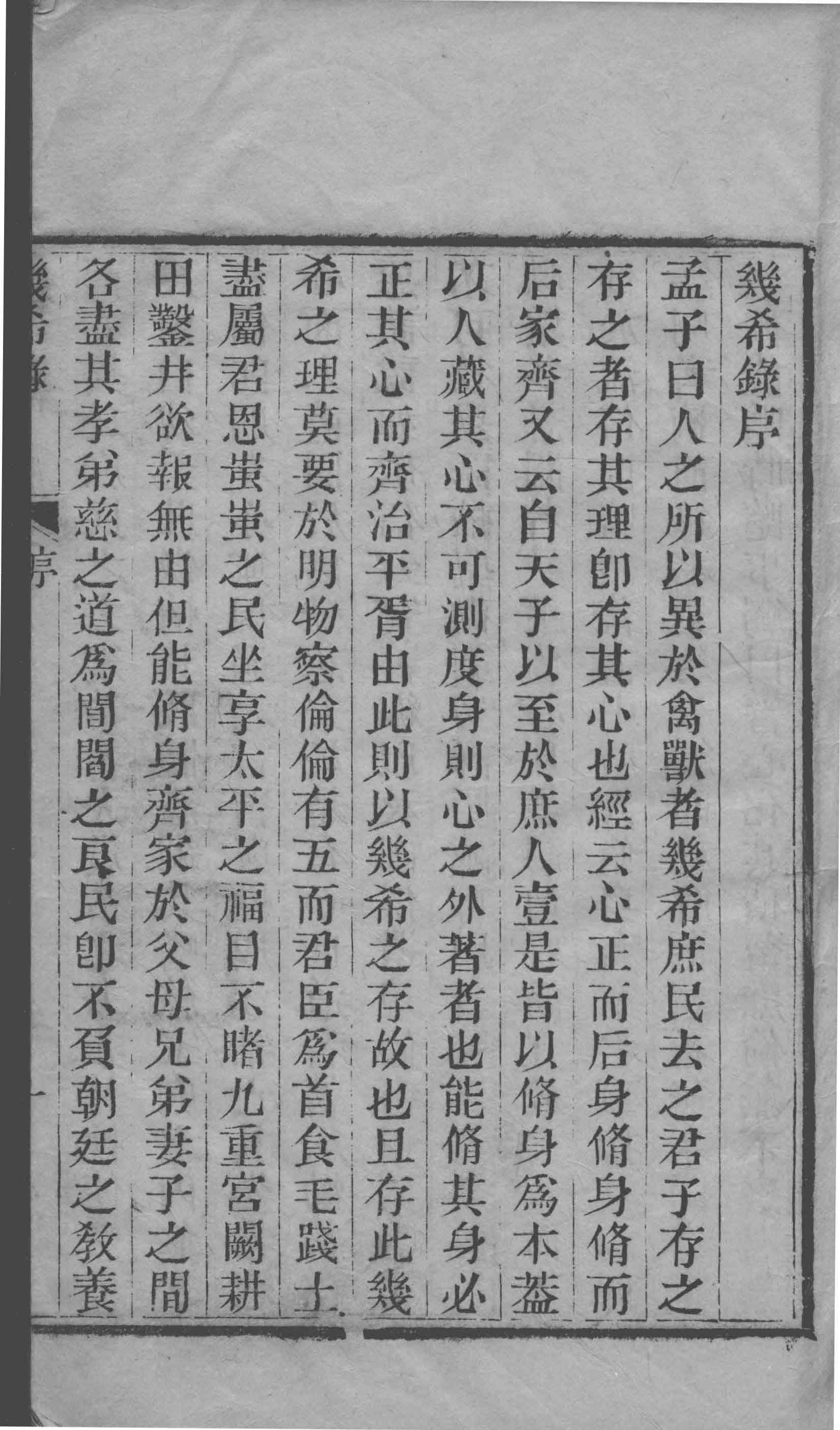 孟子云,人之所以异於禽兽者几希,庶民去之,君子存之,甚哉,吾人立身天地间,魁然七尺五官毕具,未有不愿为君子而甘為庶民者,危微之介,人兽之分西,所争祇此毫末,人欲勉为君子,则所以葆此几希者,宜何如勤勉耶,吴中向有几希録之刻,所辑皆儒先粹语,亲切指点无非示人存心处事克已反求之,要冀全存此几希,勉為君子,不歧以一念之差流為小人之归,诚醒世鸿宝也,恬兵发之后板片无存,嘉兴张君惟善平日高品好义笃信,是编为生臬者已久,深虑此书*觅无落将就淹没也,乃慨然偈首捐资更益以集验良方作为合璧,谋付剞剂一时同志之士,协力玉成。。。