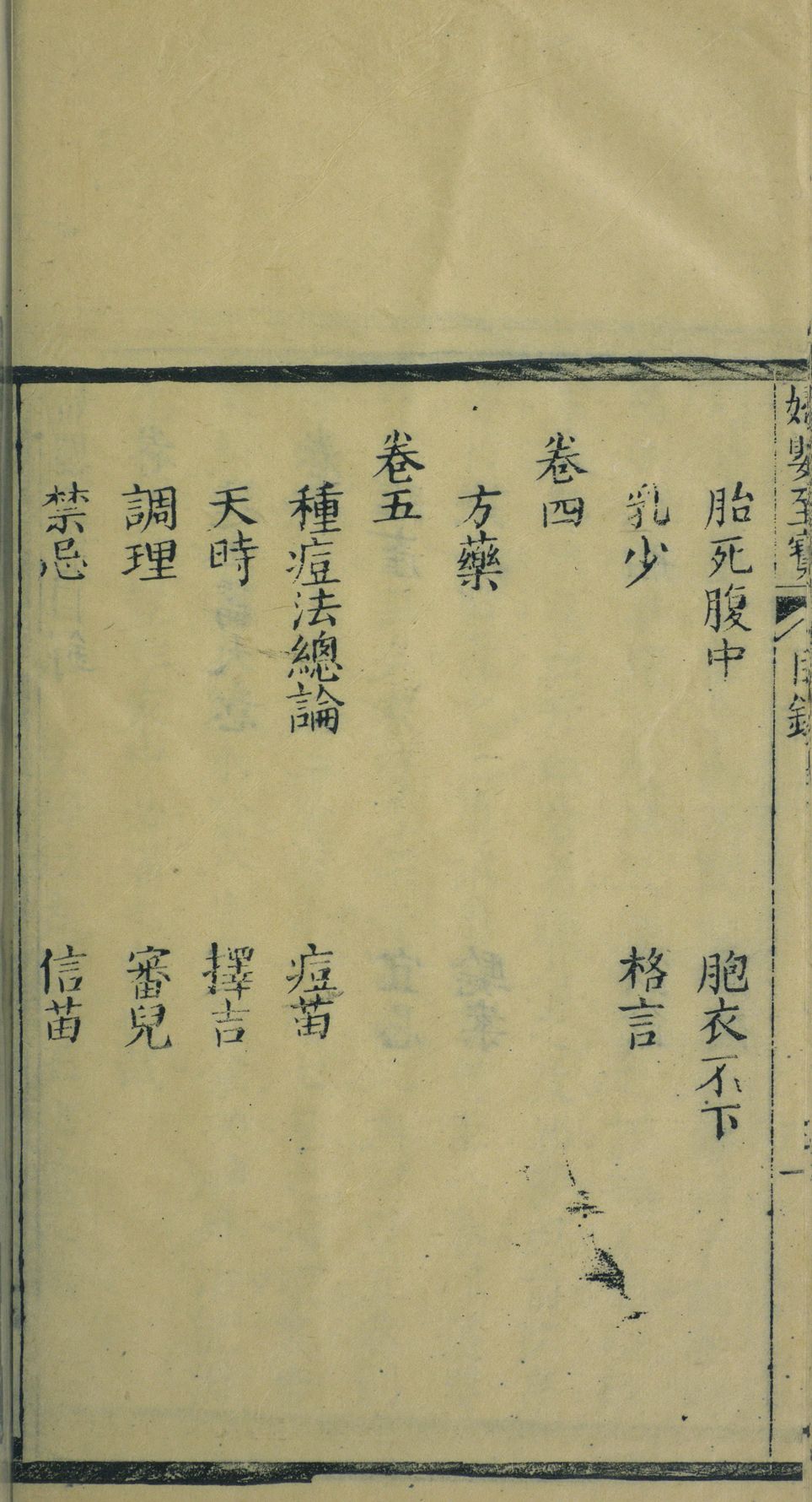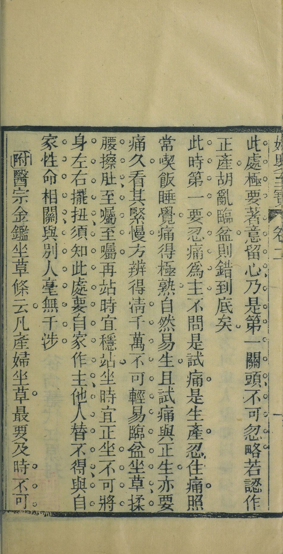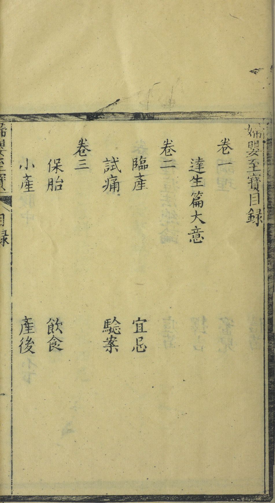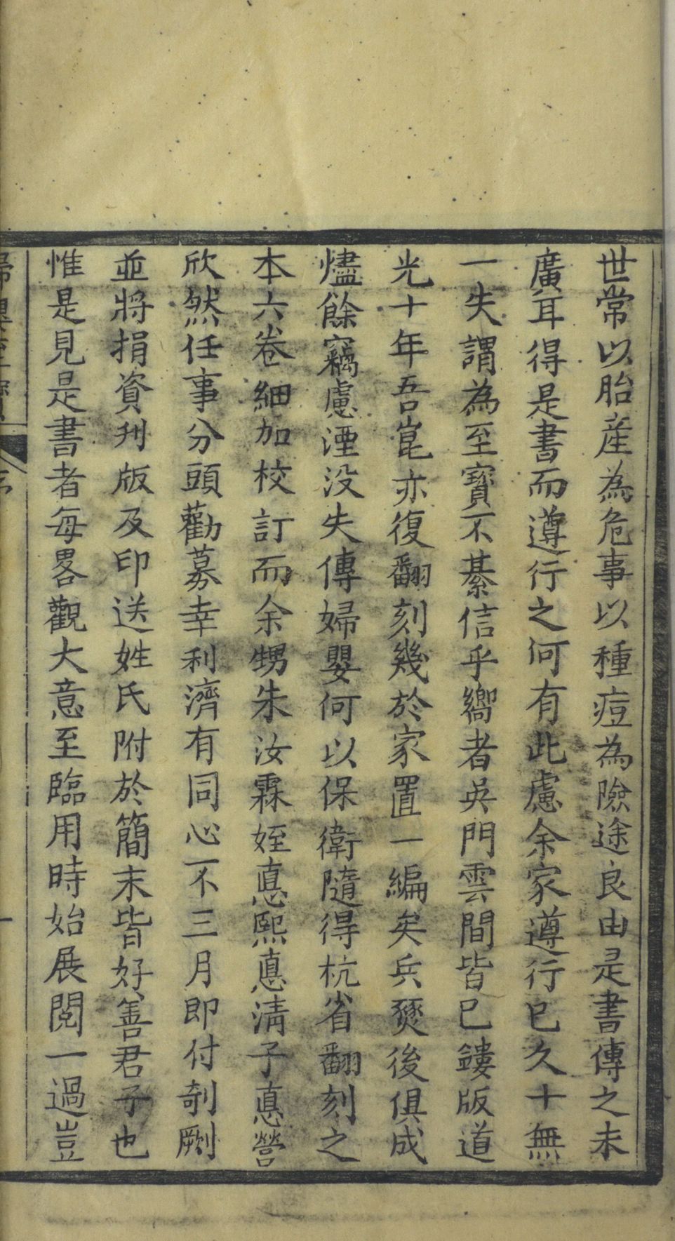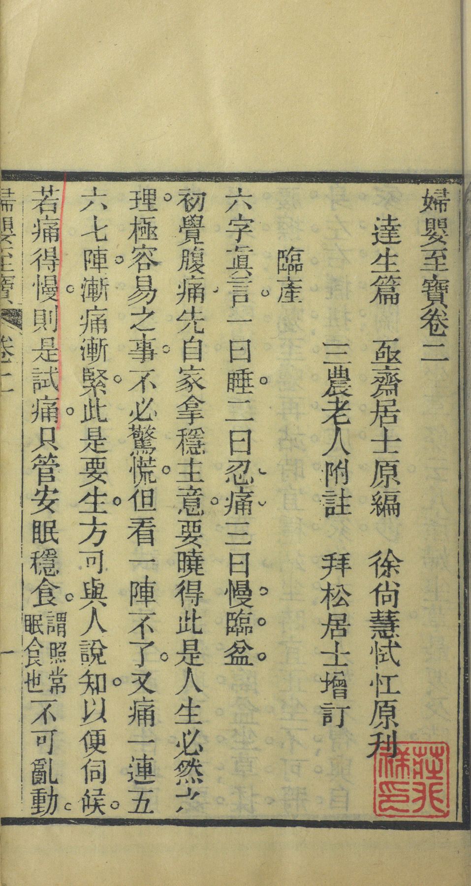 世传《妇婴至宝》一书,吾乡恜杠徐丈于乾隆十五年取亟斋居士达生篇,请三农老人钱君加注,益以毓兰居士种痘法稀痘方捐此刊刻行世,巳久寻缘原板为赵文山太守携去,无以应四方之求,徐丈内姪黄子月差於壬子岁复事开雕,奈购者甚众,甫四载而板巳漫患月差因发愿重鐫,同时好善诸君子亦踊跃襄事并附保命延生戒期於后以广流传,余受而读之议论切当解释精详,诚居家必备之书,其有益於尊生保赤者功用,非细爰怂惥速成,斯举并弁数言於卷端,嘉庆元年春正月长洲褚廷璋左峩氏书。