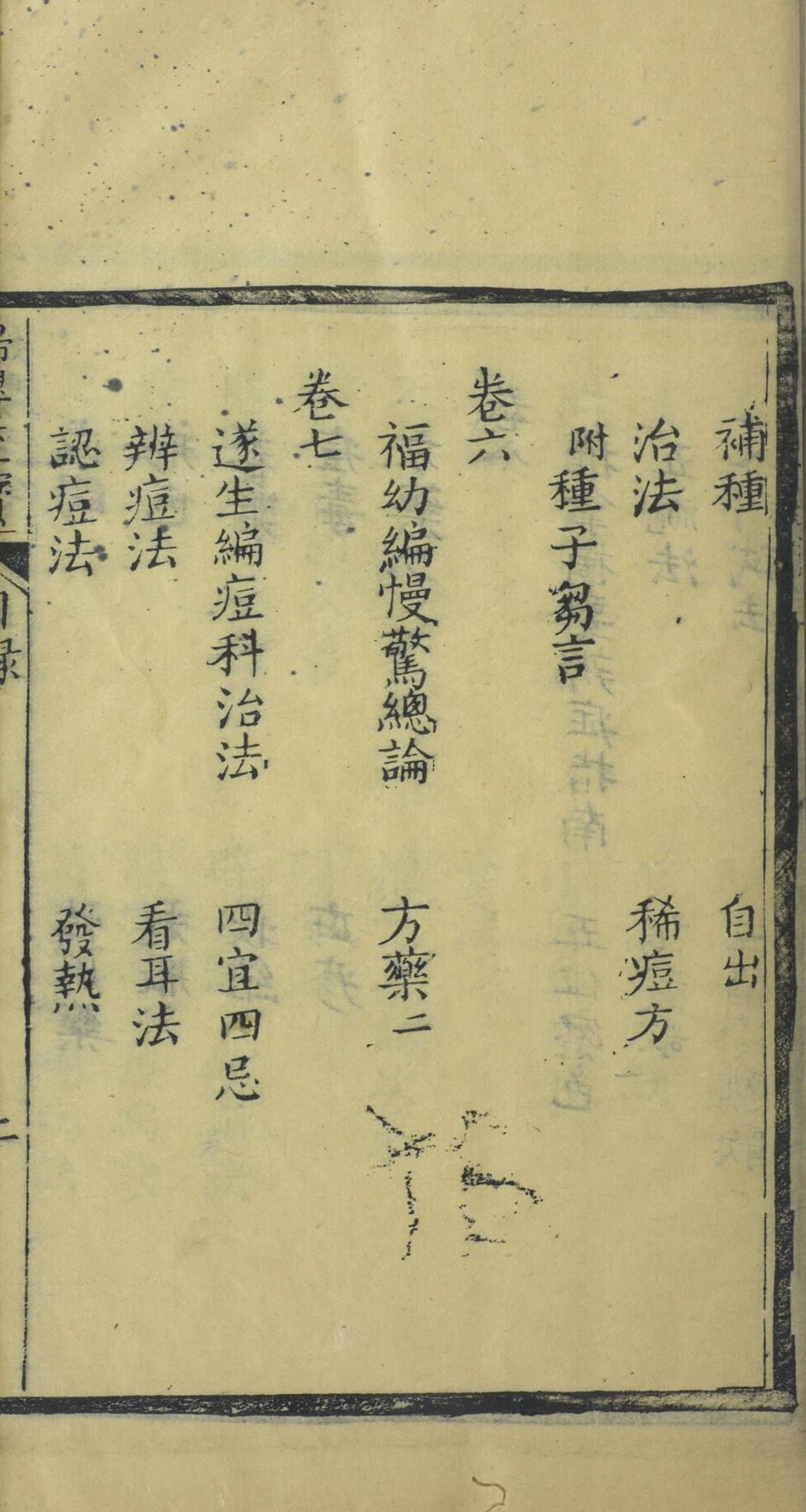 世常以胎产為危事,以种痘為险途,良由是书传之未广,耳得是书而遵行之,何有此虑,余家遵行巳久十无一失,谓為至寳,不綦信乎,乡者英门云间皆巳鏤版,道光十年吾崑亦复翻刻,几於家置一编矣,兵燹后俱成烬,余窃虑演没失传妇婴何以保卫,随得杭省翻刻之本六卷细加校订,而余甥朱汝霖姪悳熙清子悳营欣然任事分头劝募,幸利济有同心不三月即付剞劂,并将捐资刊版及印送姓氏附於简末,皆好善君子也,惟是见是书者每略观大意至临用时始展阅一过,岂能尽善,因就余家遵行次序弁於简端俾知预為调摄,自有步骤至幼孩之病,口不能言脉无从测而又不肯服药,与其内治之鲜,当孰若外治之,可凭则推拿广意一书為治小儿良法,遂摘其辨症推拿各法并绘图形附刊於后,又校订五卷,时窃念再加治痘法保婴更為周至,适悳营兜自舅氏家携归福幼,遂生合编一卷阅之,福幼巳列六卷而遂生於痘科一症,说理亦甚精当,何以分而不合,遂并付梓含成八卷,若有使之然者,同治十二年癸酉闰月玉峰王兆鼇识于安亭江上。