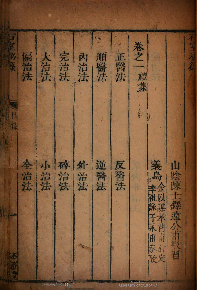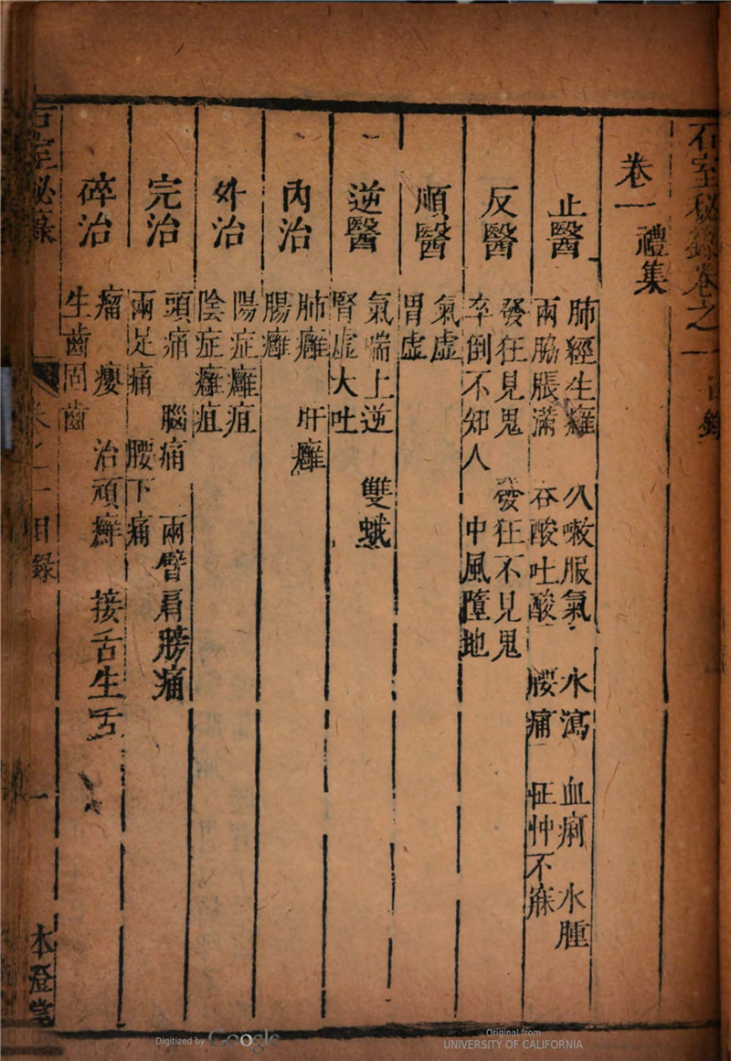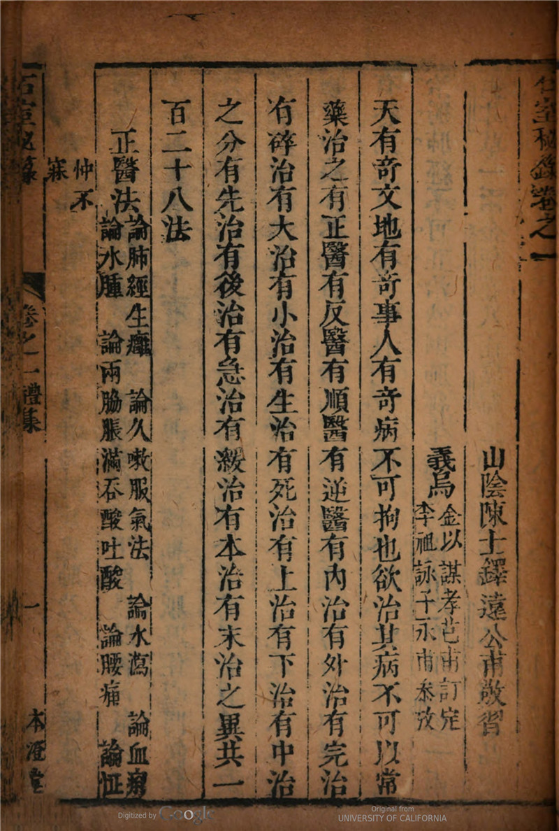 《石室秘录》康熙28年刻本,全书共854页,为清代著名医家陈士铎编著。陈士铎,字敬之,号远公,别号朱华子,自号大雅堂主人,浙江绍兴人。明末清初著名医家。约生于明天启年间,卒于清康熙前期。陈氏一生著述颇多,据嘉庆八年《山阴县志》记载,陈氏传世之作近20种,但今存世的仅6种。