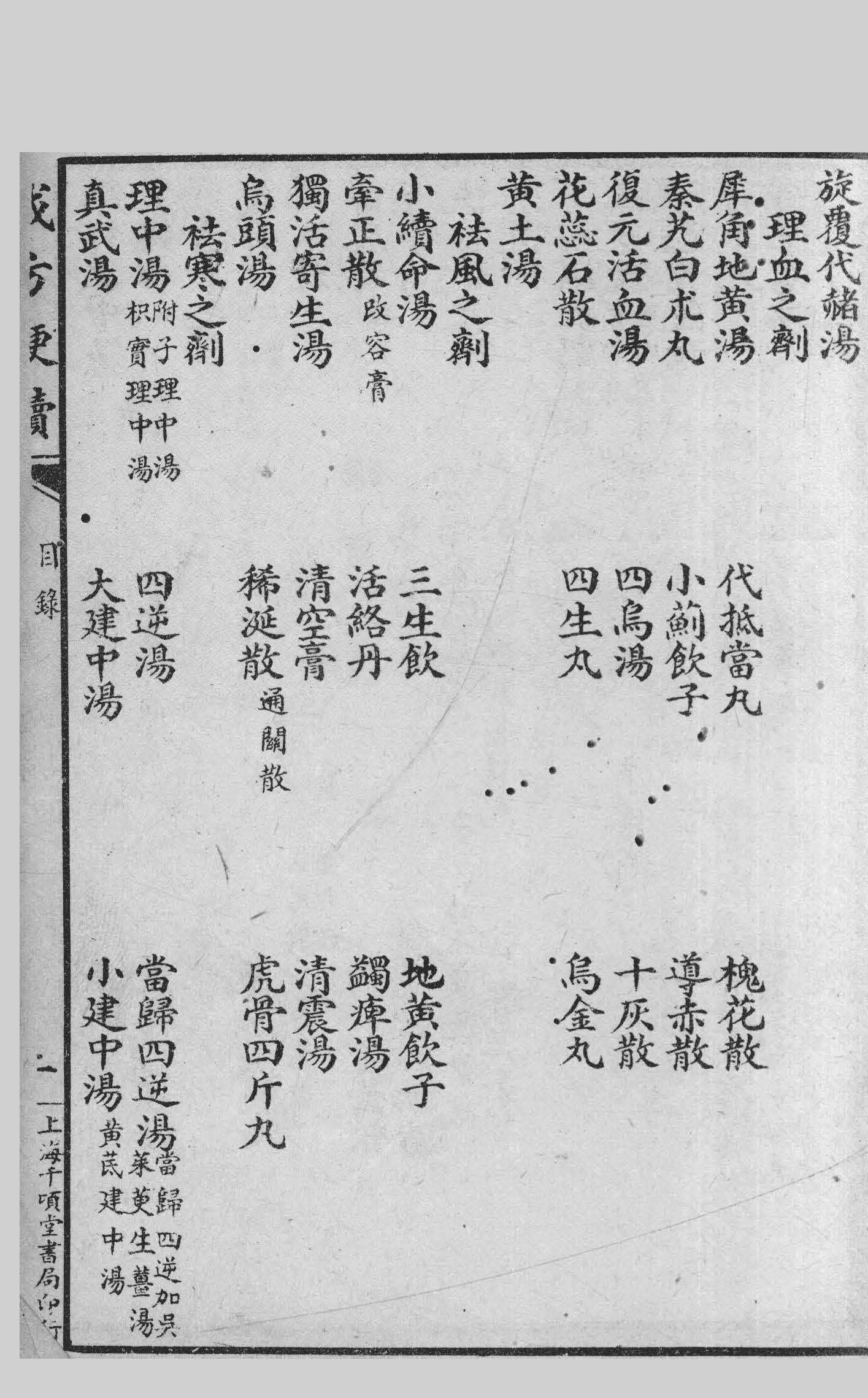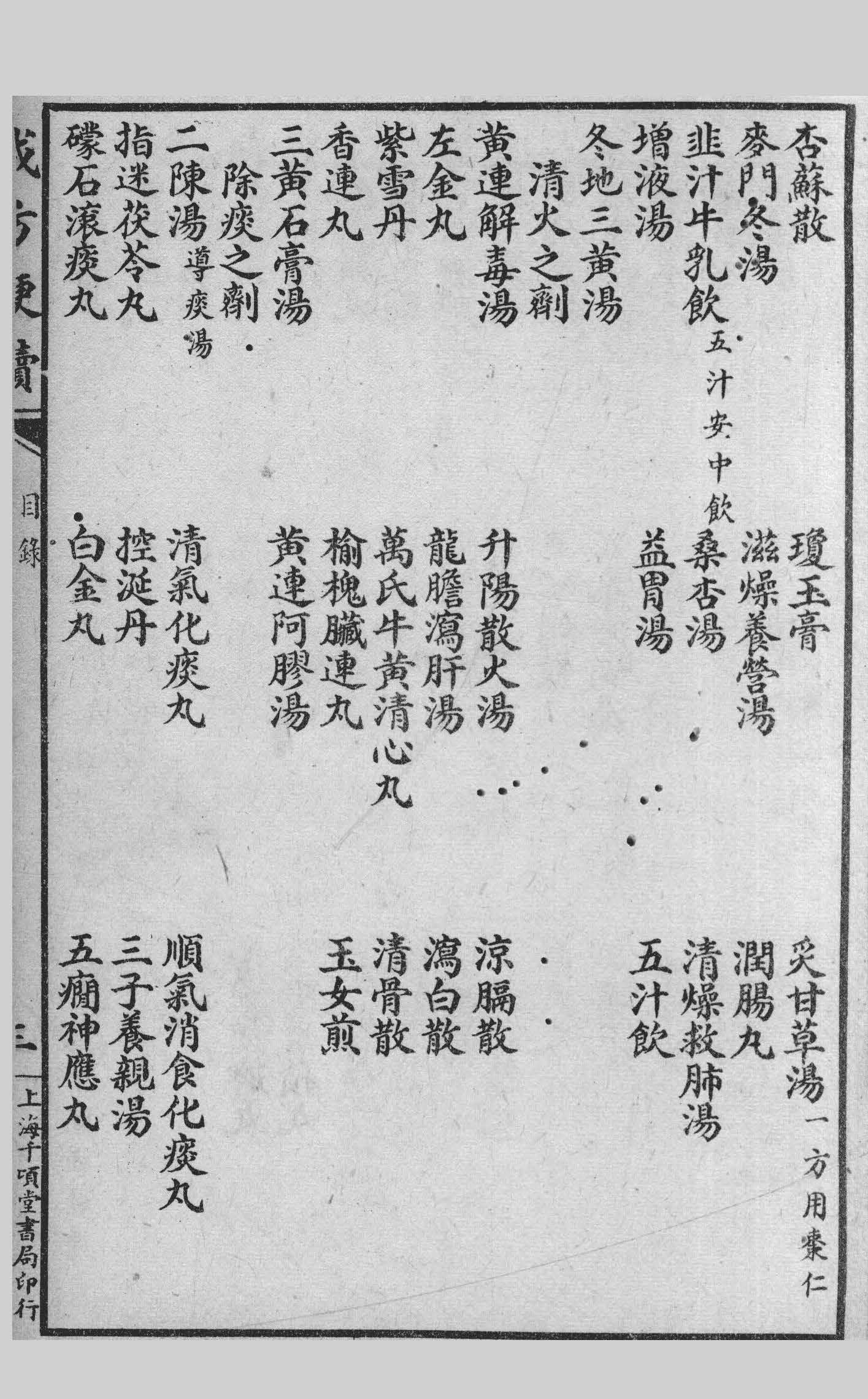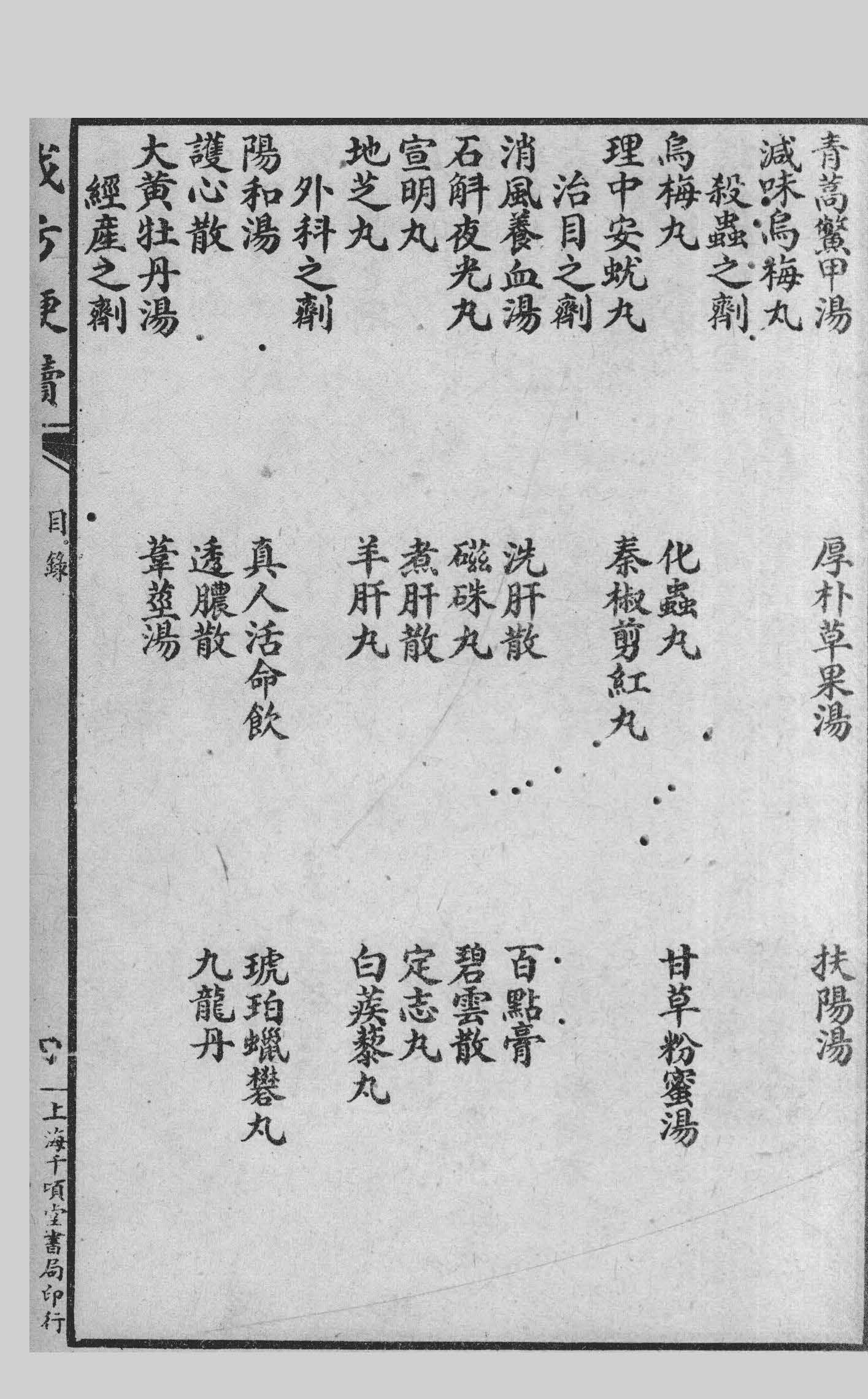 古今方书创始者首推张仲景,其他如千金外臺诸方似多杂而不纯,虽各有深意然总不能出仲景之范围,兹集為学者引进之始基,故方中仅录仲景者為多至千金外臺以及药味怪僻,非今人所常用者一概不录。