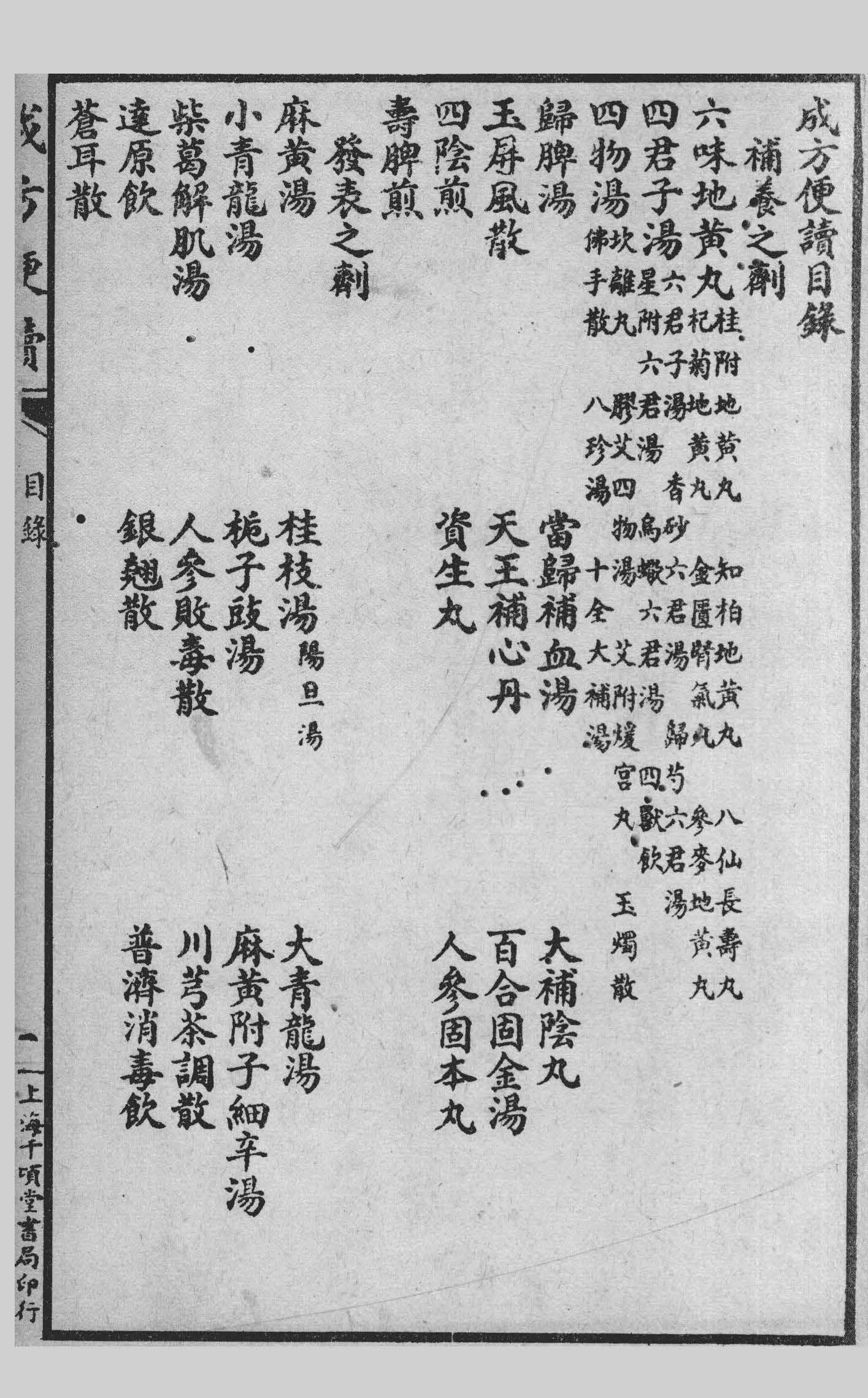 此书彚集古今成方二百餘首,即仿汪訒菴医方集解之例,分门别类编為歌诀,其间不切於时用者去之,或為世所好尚同道所趋竞如张景岳吴鞠通诸公之类,以及后时备用丸散各方皆择其尤者一概编入。