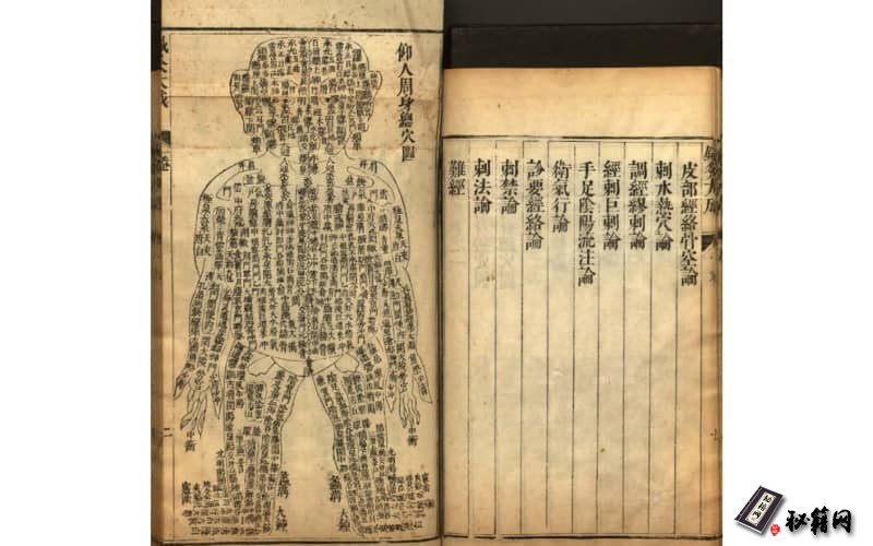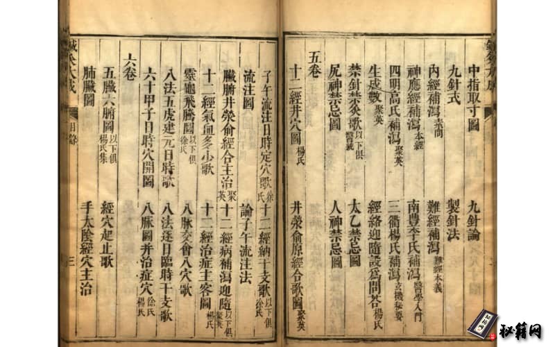 《针灸大成》为明·杨继洲著。全书凡十卷。卷一集录《内经》、《难经》有关针灸的原文,以论述针灸源流。卷二、第三为针灸歌赋。卷四主要为针刺补泻手法。卷五为井荣俞经合子午流注及灵龟八法等时间取穴方法。卷六、卷七详述十四经络、经穴及经外奇穴的部位、针灸方法及主治病症。卷八分类介绍各种病症的治法和选穴。卷九采撷名医刺法、灸法并记载杨氏医案。卷十附论小儿按摩及儿科疾病的诊断。