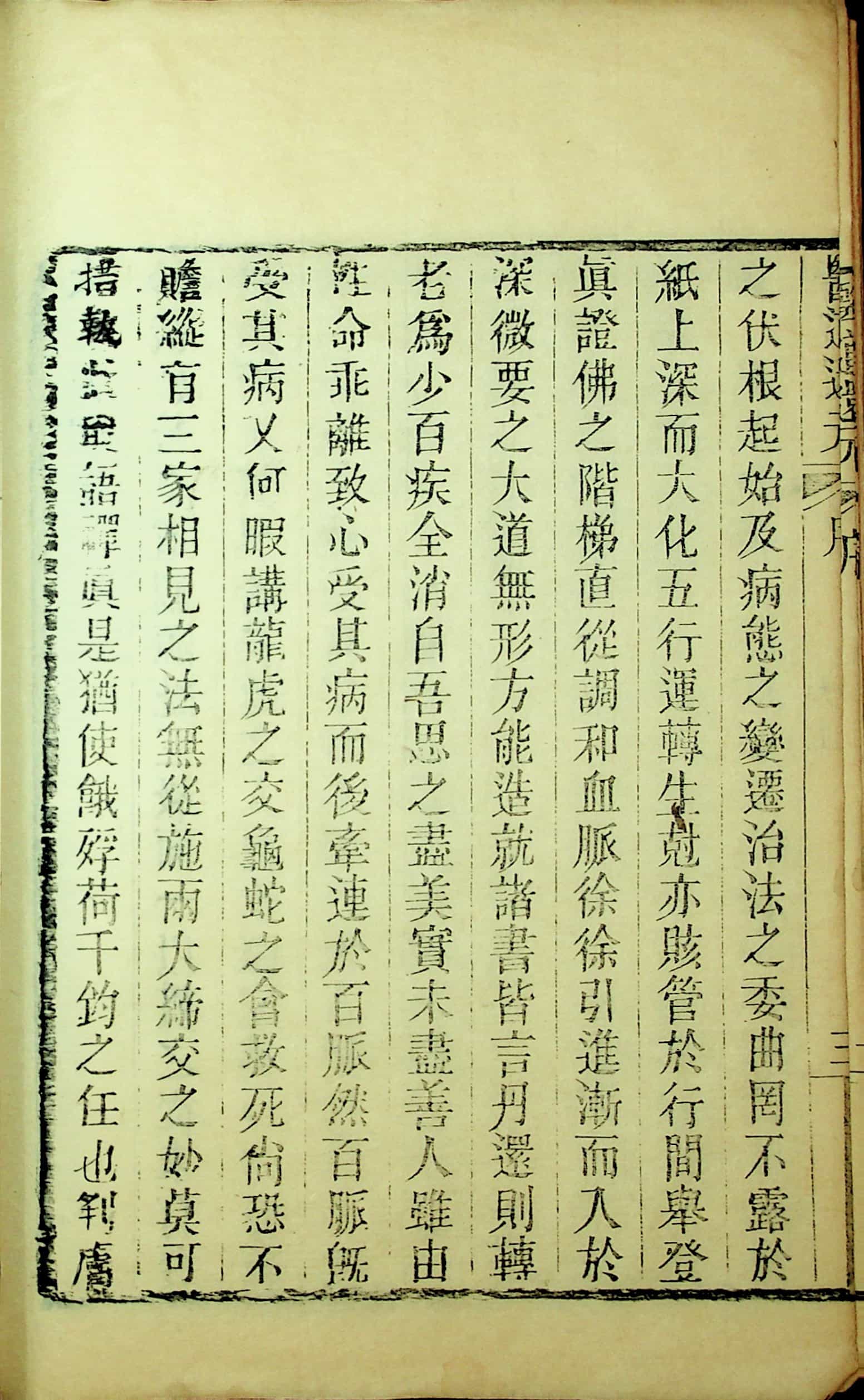 粤稽古来医家始以治病发药名世,终则入道登眞者代有其人,何则,人身百脉悉符天地奥玄其精於治病发药时,已把先天后天了然於心目,举人身上下关窍络绎,与百味之生克走守无不贯而彻之,是疗疾已得大道之度数及委心入玄宗而先天之妙道遂源流毕达今览,吕眞是书可想见其学之所从入亦由是焉,首透脉络关津百端病态药法千层,每归本於河洛寻将人身眞宰地上搜剔乎,盈虚剥复直合两大妙机,再与性命推究乎,无始之始无终之终,尽賅生天生地奥义,自首篇以迄终篇,实作仙作佛之门径,了凡入圣之阶梯,疾者读之而愈,愚者读之而慧,生智者读之而凡骨即换,眞可谓天人毕贯,三教统宗矣,人生百岁光阴,自当早寻出世妙法,倘令家家熟读,人人会通,安见疾之缠身,道之或坠耶,我佛梵音斯人罕达,今吕真著是书流传於世,靡特儒生得所益,即我佛道亦有助也,故特作数言於篇端。