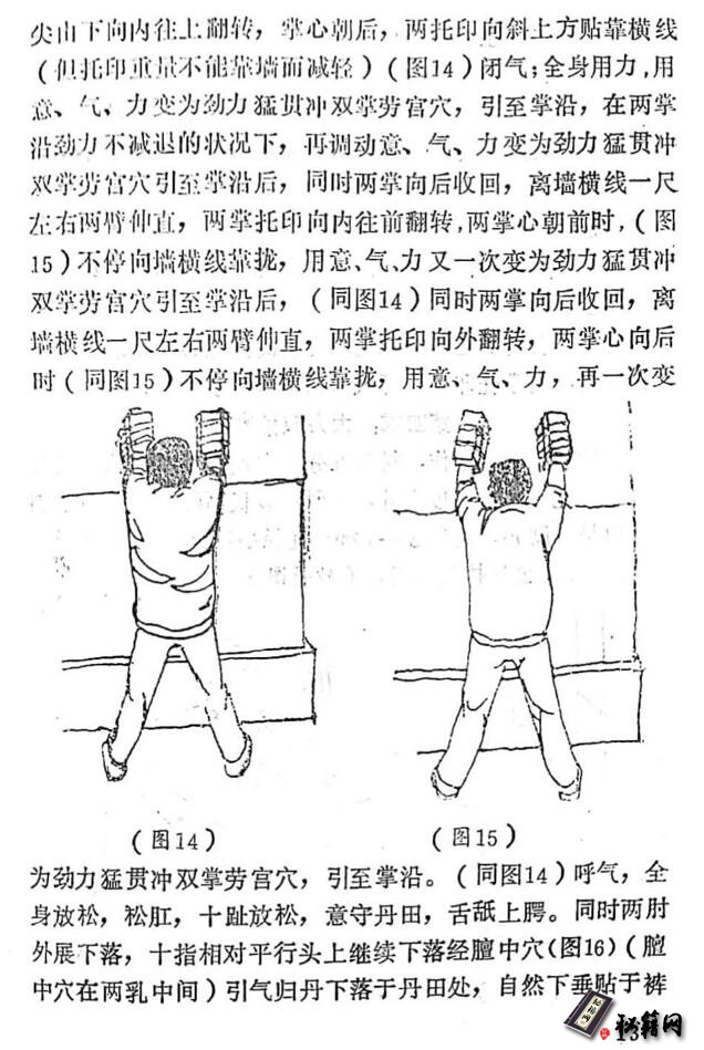 其内容精要速成法,主要以一吸、二闭、三贯通为宗旨,一吸气,以意领气,二、闭气运动全身之气,三、以意、气、内劲变为劲力“硬度”力贯双掌劳宫穴至两掌沿。