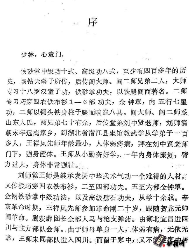 铁砂掌中级功十式、高级功八式,至少有四百多年的历史,属钻天鹤子所传,后传阎大师、阎二师兄弟二人,大师专习十八罗汉童子功,铁砂掌功夫;以铁腿阎而著名。二师专习巧穿四衣铁布衫1-6部功夫,金钟罩,内五行七星功,二师以铜头铁身柱子腿而响遍八县。阎大师、阎二师系山东人氏,两兄弟七十有余,后传堂弟刘中贤老师,刘师清朝末年远离家乡,到湖北省潜江县坐馆教武学从学弟子一百多人,王祥凤先师年龄最小,人体弱多病,拜在刘中贤老师门下,强身健体。王师从小勤奋好学,,一年内身体康复,臂力过人,身体非常强壮。.
