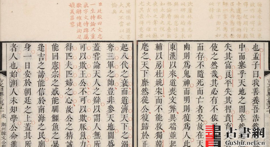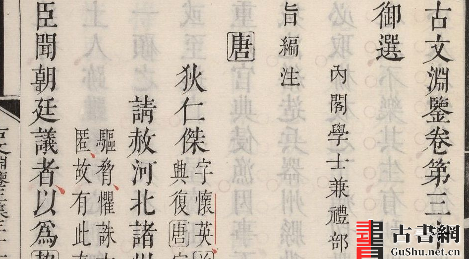 此书亦名《渊鉴古文选》,是集历代散文为一书的文学总集。康熙皇帝认为,将中国古文选编为总集的除梁萧统的《文选》外,尚有唐姚铉的《文粹》、宋吕祖谦的《文鉴》等,它们所选取的都是某一朝、某一代的文章,然而古今文章却是源远流长,盛衰错综,怎可局限于一朝一代?故于康熙二十四年亲自选录上起春秋、下迄宋末的文章,包括左传、国语、国策等书及诒、表、书、议、奏、疏、论、序诸体文,择其辞义精纯可以鼓吹六经者汇为正集;间有瑰丽之篇,列为别集;旁采诸子录其要论,以为外集,共合1,324篇。康熙逐篇品评,命徐乾学等人编注。该书参照宋真徳秀的《文章正宗》、李善注的《文选》、楼昉的《古文标注》等书例,严格筛选,考证详明,详略得宜,并载前人名家评语、康熙御批和徐乾学等11人所作注释,交武英殿以五色套印颁行。凡正文以墨色示之,前人诸家评语列诸书的天头,分别以黄、绿、蓝三色示之,康熙御批并本朝诸臣注释亦列诸书眉,用朱色标示。另正文有朱色断句。康熙四十九年刊刻完竣。其雕镌、套色、刷印皆极精工,朱、墨、黄、蓝、绿五色鲜明艳丽,令人爱不释手,显示出清初内府多色套印技术的高度水平。