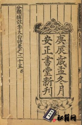 此《分类补注李太白诗》为唐李白撰,宋杨齐贤集注,元萧士赟补注。全书共二十五卷,包含古赋、古风、乐府、歌吟、赠寄、送、酬答等题材。此内含元至大勤有书堂刊本、明正德安正书堂刊本、明嘉靖吴会郭云鹏编刊本、明万历长洲许自昌校刊本。