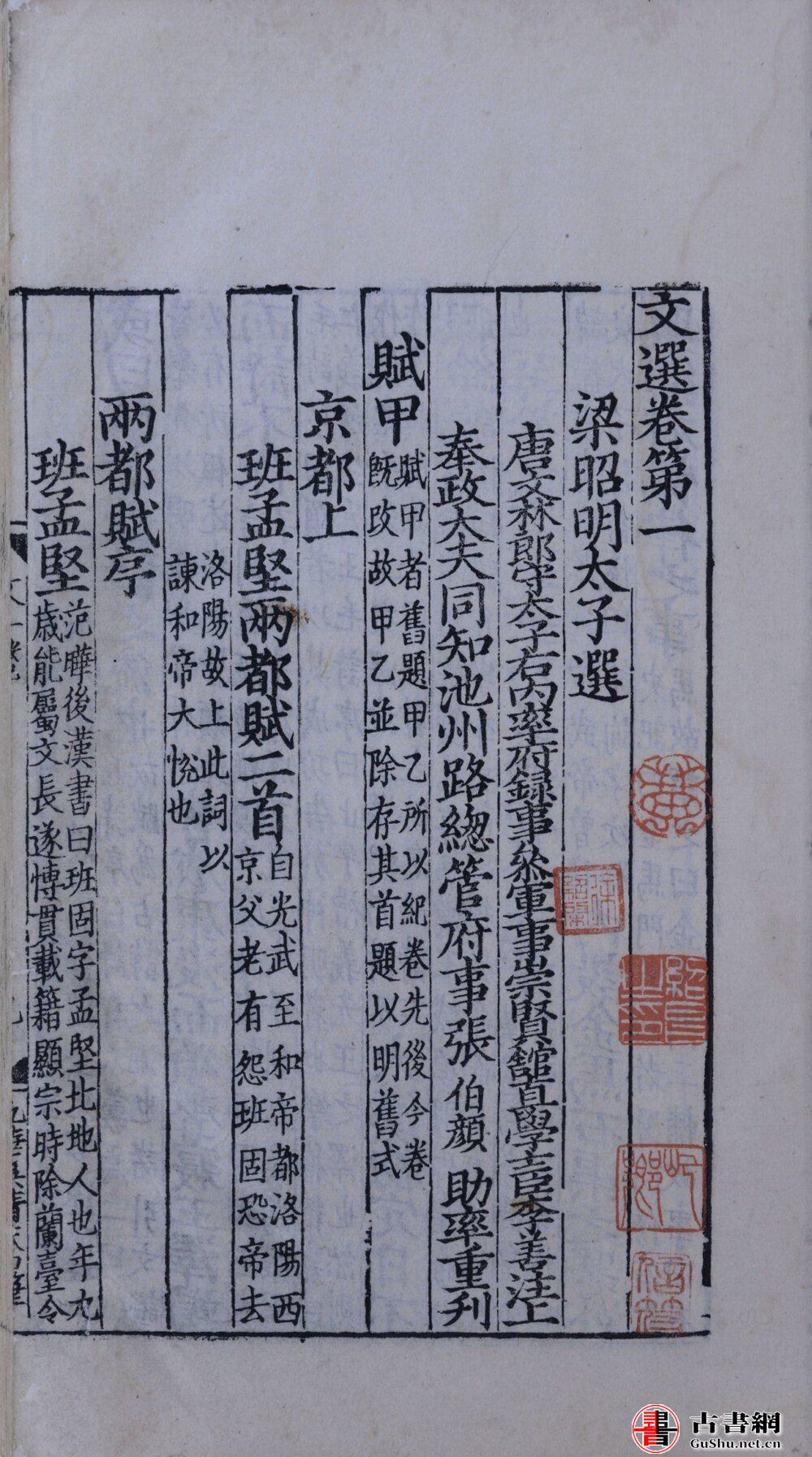 古籍.文选. 六十卷. 南《文选》是中国现存的最早一部诗文总集,由南朝梁武帝长子萧统组织文人共同编选。此《文选》由唐李善注,全书共六十卷,选录了先秦至南朝梁代八九百年间、一百多个作者、七百余篇各种体裁的文学作品。此为明嘉靖元年金台汪谅校覆刊元张伯颜本,书前目录后有书目广告(已知最早)一则。《文选》又称《昭明文选》,因萧统死后谥 “昭明”,所以他主编的这部文选称作《昭明文选》。一般认为,《昭明文选》编成于梁武帝普通七年(526)至中大通三年(531)之间。在这部总集里,萧统把我国先秦两汉以来文史哲不分的现象作了梳理和区分,他认为经史诸子都以立意纪事为本,不属词章之作,只有符合 “事出于沉思,义归乎翰藻” 的标准的文章才能入选。也就是说 ,只有善用典故成辞、善用形容比喻、辞采精巧华丽的文章,才合乎标准,《昭明文选》正是以此来划分文学与非文学界限的第一部选集。(介绍参考)