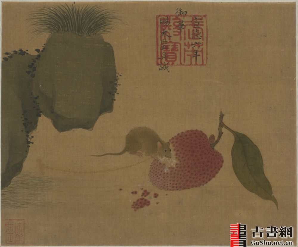 此图绘小鼠啃食一只红荔。荔壳已被小鼠啃破,散落于地,白色的果肉裸露在外,老鼠正专注偷食中,两只狡黠的小眼警惕地盯着周围。老鼠被一根铁链拴着,在其后侧为一块寿石,上有一簇菖蒲。寿石两侧则有点苔。与前图不同的是,画中鼠、荔枝和荔叶均为工笔,荔枝为重彩。作者用笔细腻端正,几无懈笔。寿石菖蒲则为水墨,小写意。其水墨的 “黑” 与荔枝的 “红” 形成鲜明的视觉反差。小鼠则为浅灰,细微处毛发毕现,形神皆备。题识: “宣德六年御筆,賜太監吳誠” ,上押朱文方印 “武英殿寶” 。