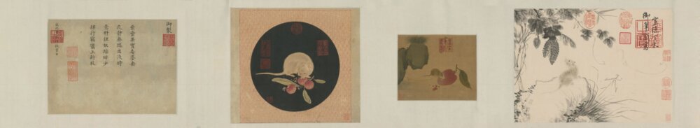 此图为一帧团扇,其构思与《菖蒲鼠荔图》大致接近。所写为一只白鼠啃食三只荔枝,荔壳散落于地,另有三片绿色的荔叶陪衬。由于此画写在瓷青纸万年蓝上,故老鼠的 “白” 与荔枝的 “红” 在蓝色底纸的衬托下,显得尤为抢眼,似有描写老鼠在夜幕下偷食的背景。此画亦为工笔重彩,颇有宋代院体花鸟画风格。画上并无作者题识,但对幅有明宪宗朱见深题跋:“御製。累累果實委塵垂,夜靜無端出沒時。意料狸奴踪跡少,肆行竊齧上新枝。成化甲辰仲秋吉日” 此跋作于成化二十年。