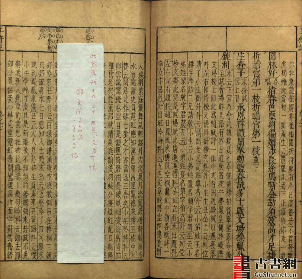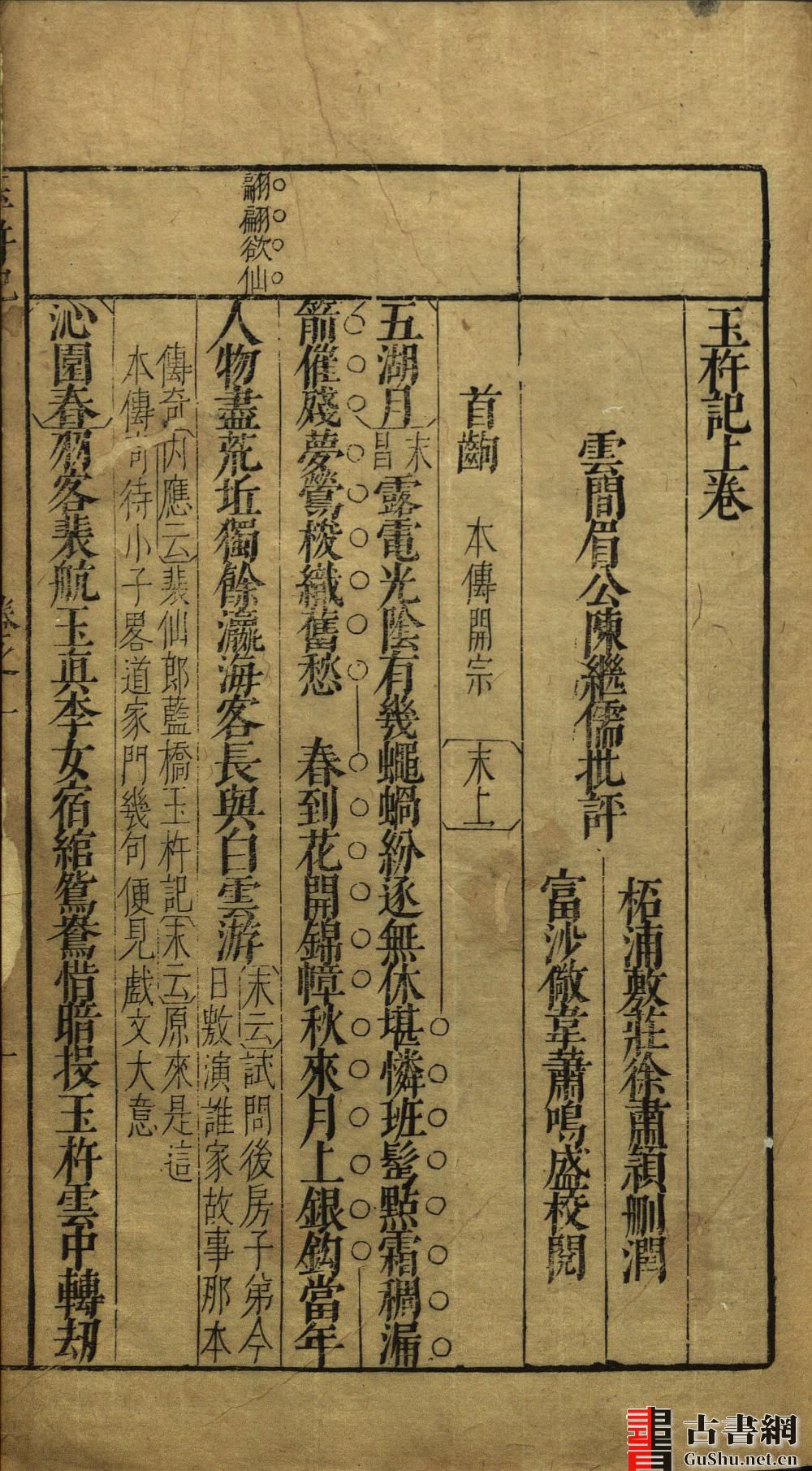 邓长风考曰:” 陈眉公评本 … 其中最值得重视的是《玉杵记》。此本全名《裴仙郎蓝桥玉杵记》,浙江馀姚人杨文炯(杨之炯)作。近代藏曲名家吴梅、郑振铎、齐如山等皆未经入藏,近人所有戏曲书目著作皆未予著录,故很可能是海外孤本(郑振铎曾藏有万历间浣月轩刊本《玉杵记》,已收入《古本戏曲丛刊》初集)。此本凡二册一函,二卷三十七出,刊刻极精,可惜开首已佚去四页,故扉页、序、凡例等已不可见”。