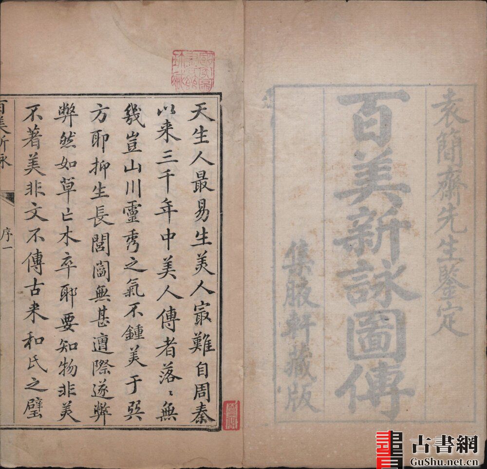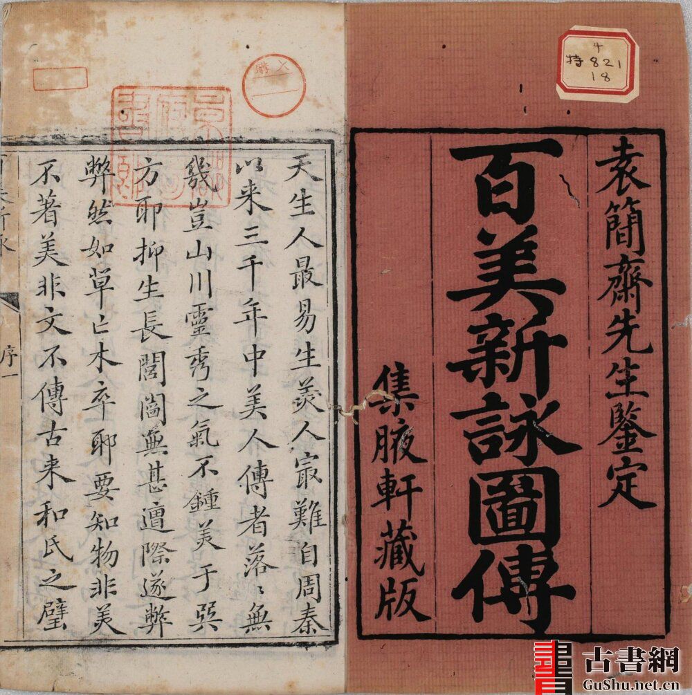 此为清乾隆五十七年刊本《百美新咏图传》。对比两个版本发现,除了部分序跋不一样,清嘉庆十年刊本多一些嘉庆时期人物的序跋。虽然书名页都题:集腋軒藏版。但清乾隆五十七年刊本人物刻画的精细度更好。