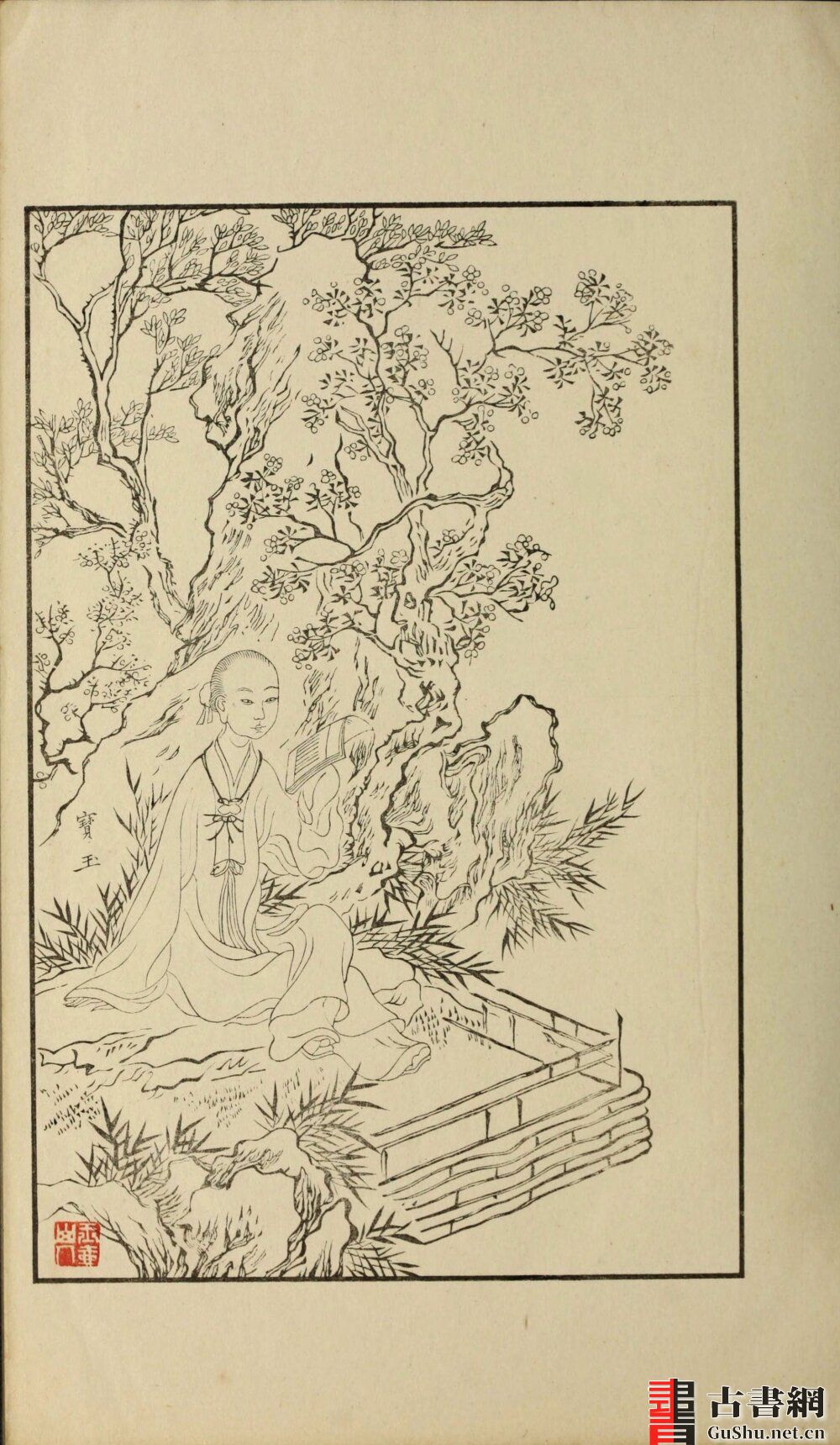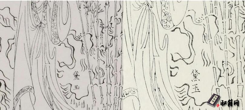 第一册 “黛玉” 一幅图画中之 “玉” 字有长扁之别,原刻本 “玉” 字较扁,翻刻本 “玉” 字较长。伊藤漱平在文章中说,原刻本与翻刻本的区别,除了板框的尺寸与钤印有异之外,画中人物的名字笔划,原刻横长,翻刻纵长,并举 “黛玉” 一幅作为说明。故以扁玉字本为佳。
