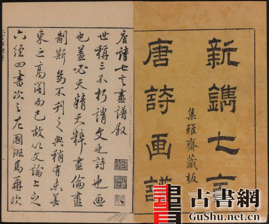 中国是一个诗的国度,而唐诗是这个诗国中最为璀璨夺目的一颗明珠。唐诗,不仅为国人所激赏,更引起了近现代西方语言学诗歌批评的高度重视,他们甚至认为唐诗犹如马蒂斯、塞尚的绘画,可以印证其有关文学意象与语言结构的理论。 《唐诗画谱》诗选唐人五言、六言、七言各五十首左右,书求名公董其昌、陈继儒等为之挥毫,画请名笔蔡冲寰、唐世贞为之染翰,刻版出自徽派名工刘次泉等之手,堪称“四绝”。被时人誉为“诗诗锦绣,字字珠玑,画画神奇”。由于书坊主人、写、刻工,原皆徽州人,后移居至杭州,故本书虽在杭州出版,却处处流露出徽州版画的细致风格,而透过古籍版画风格的转变。全书共包含八种画谱,所以又名《集雅斋画谱》、《八种画谱》。前三种各一卷,为集雅斋主人黄凤池所辑,蔡冲寰等绘,刘次泉等刻。各取唐诗五十首,按诗意绘成图画。