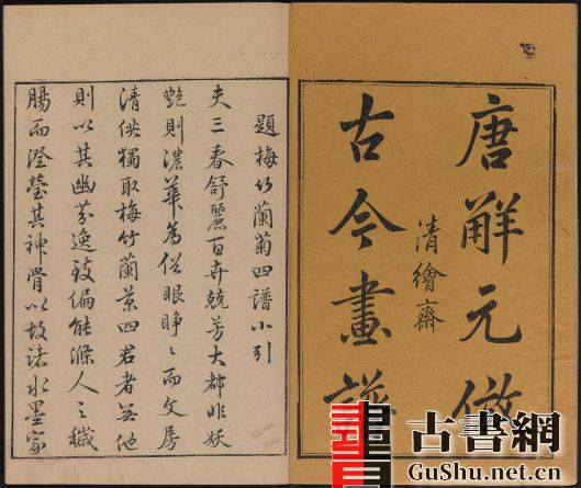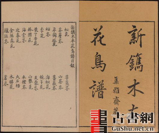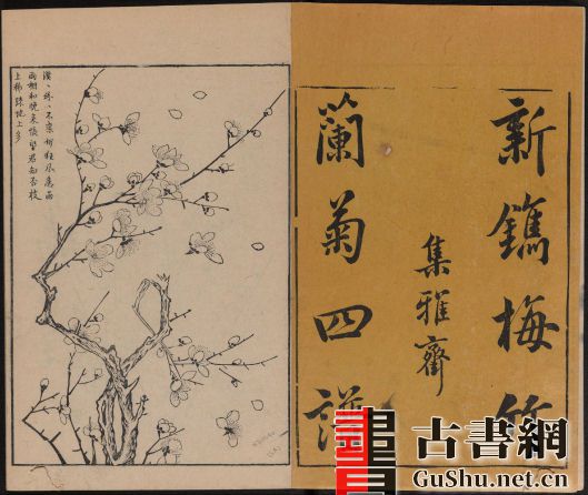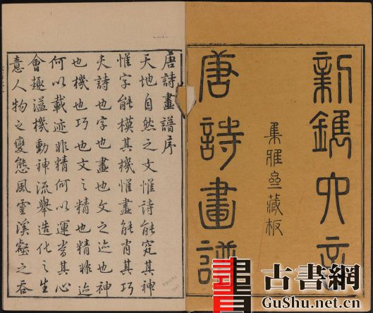 《唐诗画谱》由明代集雅斋主人黄凤池编辑,为诗、书、画三美合一的版画图谱,是徽派版画代表作之一。此本包含八种画谱:五言唐诗画谱、六言唐诗画谱、七言唐诗画谱、梅竹兰菊四谱、木本花鸟谱、草本花诗谱、唐解元仿古今画谱、张白云选名公扇谱。此套约刊印于1672年。