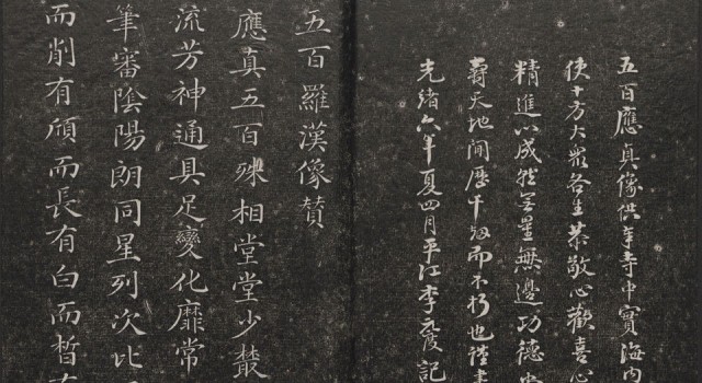 东汉时期,随着佛教的传入,佛教题材的绘画应运而生。至唐永徽四年(654年)玄奘译出《大阿罗汉难提菩多罗所说法住记》后,对罗汉之崇拜逐渐“普及”,开始出现雕塑罗汉像,唐代的王维、五代的贯休、宋代的张玄、清代的姚宋等都曾创作了一些宣扬罗汉的艺术作品,但存世极少。五百罗汉的事迹,诸经说法不一,大致可分为佛在世时的五百罗汉与佛灭后的五百罗汉。佛在世时的五百罗汉是指佛所渡化的比丘群(每每有五百之数)。也可说佛在世时,所渡化的最有成就的五百比丘。另一说,佛在世时曾渡化了五百位盲乞人,他们最后也都成就了阿罗汉果。佛灭后的五百罗汉,据《舍利弗问经》,当指弗沙秘多罗王毁灭佛法后,重兴圣教的五百罗汉。另外,在佛教史上流传着四次的结集大事,每次都由大阿罗汉们担当大任,其中第一次为佛灭度迦叶尊者与五百阿罗汉最初结集三藏,第二次是七百罗汉,第三、第四次也都是五百罗汉。现在一般认为,五百罗汉均为释迦牟尼佛的弟子,佛灭后,他们整理了佛的教义,并广为传播,因而取得了小乘教的最高地位——罗汉的称号。五百罗汉创作题材属于多体罗汉创作题材之一,我国关于五百罗汉的故事,早在东汉随着“佛说兴起行经”开始流传,两晋以来,“佛五百弟子自说本起经”、“增一阿含经”等有关经典的相继译出,五百罗汉的事迹随着这些佛教经典而广为流传,但是影响美术创作却相当晚。盛唐的敦煌莫高窟的壁画中,有许多“涅槃变相”的题材,画中有无数悲戚的佛弟子们可以说是我国早期的罗汉形象。而龙门石窟中却刻出了二十五体和二十九体的罗汉。中唐的寺壁中也多有传法弟子或六十罗汉等题材。可以说这些多体罗汉,开了后来五百罗汉创作的先河。五代时期,兴起了十六罗汉创作的风气,同时开始了五百罗汉的创作,现存最早的五百罗汉形象就是五代时期的石窟造像,造像风格上有形式化的倾向。两宋时,五百罗汉创作进入辉煌期,无论绘画还是雕塑,五百罗汉创作均力求捕捉罗汉内心之感情与神韵,且融合禅意与文趣,风貌独特,生动感人。明清以降,五百罗汉流于摹擬和因袭,少有创意,但在艺坛上仍占有一席之地。中国佛教的五百罗汉,虽名号不同,神态各异,但却有一个共同点:罗汉们被视为力量和吉祥的象征,几乎家喻户晓,有口皆碑。我国的许多寺庙也不惜工本精心塑造五百罗汉像,如北京碧云寺、成都宝光寺、武汉归元寺、苏州西园寺和寒山寺、上海龙华寺、广州华林寺、昆明筇竹寺及重庆吉星寺等。五百罗汉造像形式有泥塑、铜铸、雕刻、绘制、纸褙等。江苏常州天宁寺碑刻是依据宋代杭州净慈寺的五百罗汉塑像绘画摹勒上石刻成的,其像神形兼备、惟妙惟肖、栩栩如生,惜在清咸丰年间毁于兵燹,仅有拓片流传民间。清光绪年间,南岳祝圣寺高僧释心月,据天宁寺传世碑刻拓片摹刻于石,而此碑也于“文革”中毁弃。(文字介绍来源于:线装书局)
