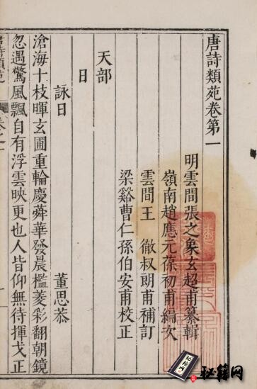 历代总集常见的类型有三种,即分体、分类、编年。唐诗选本自唐顾陶《唐诗类选》始以类编排,继之以北宋李昉等人的《文苑英华》、王安石的《唐百家诗选》(分类本今存残卷)、南宋赵孟奎的《分门纂类唐歌诗》、宋末元初方回的《瀛奎律髓》。至明代张之象《唐诗类苑》的出现,才算是真正意义上分类编纂的唐诗总集。原因在于:顾陶《唐诗类选》已佚,惟《文苑英华》卷七一四载有顾陶《唐诗类选序》和《唐诗类选后序》,能推知此书概貌一二。《文苑英华》并不是严格意义上的唐诗总集,而是一部收录南朝梁末至唐五代的诗文总集,其编纂体例是先分体后分类。王安石的《唐百家诗选》分类本现存只有宋刻残本,即《百宋一廛赋》所注在小读书堆的分类宋椠残本,现藏日本静嘉堂文库,中国国家图书馆藏有静嘉堂文库于日本昭和十一年(1936)影印宋刻分类本。赵孟奎的《分门纂类唐歌诗》已残缺,现存仅十一卷,即 “天地山川类” 五卷,“草木虫鱼类” 六卷,今有宛委别藏录绛云楼藏本《分门纂类唐歌诗残本》十一卷。方回的《瀛奎律髓》是一部专选唐宋五、七言律诗的诗歌选本,也不是严格意义上的唐诗选本。因此,作为分类编排体系的唐诗总集,《唐诗类苑》是现存最早、规模最大、体系相对完备的著作,是分类唐诗总集的扛鼎之作。(介绍参考:张之象《唐诗类苑》研究述略)