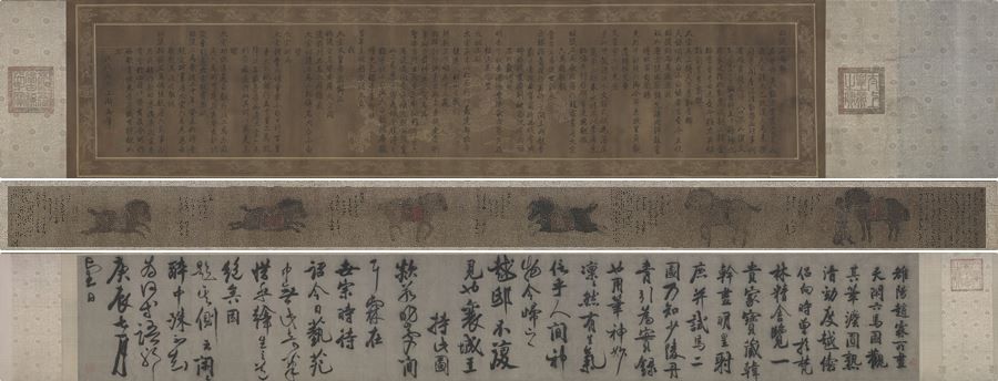 此《昭陵六骏图》卷为金代赵霖作。此图依据唐太宗昭陵六骏石刻而绘,绢本设色,全卷分六段,每段画一马,分别为:飒露紫、拳毛騧、白蹄乌、特勒骠、青骓、什伐赤。旁有金代著名书法家赵秉文所写题赞。卷引首有清乾隆帝书《昭陵石马歌》,卷后有赵秉文题记。此卷现藏于北京故宫博物院。