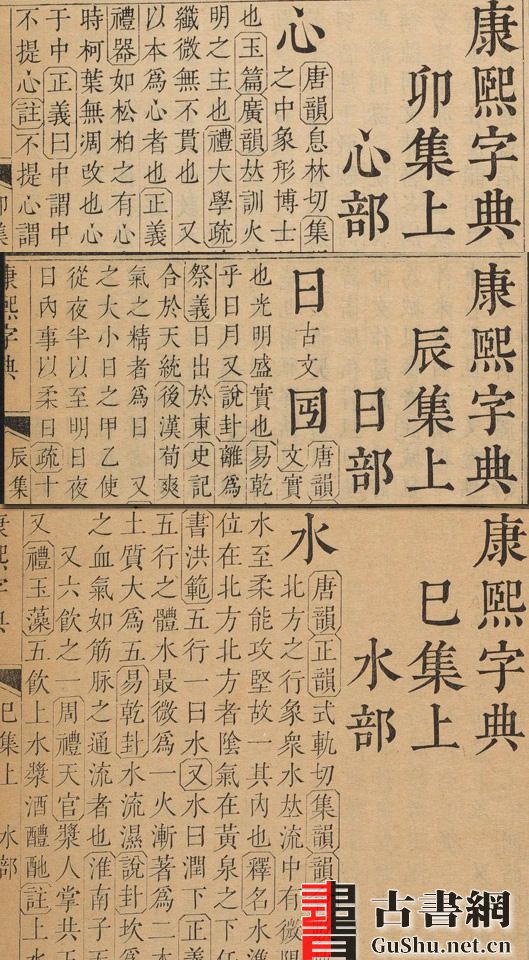 此套《康熙字典》,共四十二卷,康熙五十五年武英殿本,以地支分十二集,每集三卷,冠以“总目”、“检字”、“辨似”、“考异”,尾附“补遗”、“备考”。部首及每部之字以笔画为序,字单占二行,释文双行。每字之下先列《唐韵》、《广韵》、《集韵》、《古今韵会举要》、《洪武正韵》等书音切,次训义,广征典籍例句、字书释义例句,有所考证则附于后,次列别音别义、异读异体。《康熙字典》依据明朝《字汇》、《正字通》两书加以增订。对两书错误之处,《康熙字典》还做过一番“辨疑订讹”的功夫。《康熙字典》有这样三个优点:一、收字相当丰富,在很长一个时期内是我国字数最多的一部字典(直到一九一五年《中华大字典》出版,达四万八千余字,才超过了它)。二、它以二百一十四个部首分类,并注有反切注音、出处、及参考等,差不多把每一个字的不同音切和不同意义都列举进去,可以供使用者检阅。三、除了僻字僻义以外,它又差不多在每字每义下,都举了例子;这些例子又几乎全都是引用了“始见”的古书。本书共四十册,四十二卷,以地支分十二集,每集三卷。由于文件太大分为四个PDF文件: