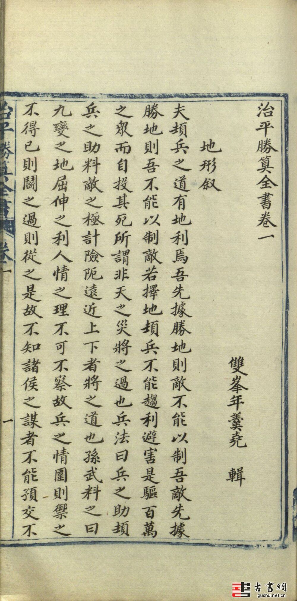 正文卷端題"治平勝算全書卷一",下署:雙峯年羹堯輯