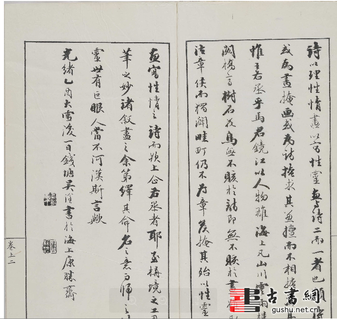 此《诗中画》由晚清画家马涛编。全书分为上下两卷,分别题署:理臻摩诘、停云小愒画胜。其内容为山水人物画约一百二十二幅,每幅配以一两句前人诗作并钤印。此为清光绪十一年石印刊本。