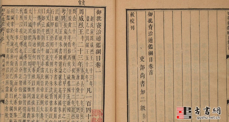 《前编》卷前有康熙四十六(1707年)年御制资治通鉴纲目全书序;《正编》卷前有朱子序例、总目录、凡例、后语、尹起莘发明序、贺善书法序等,应为一卷,称卷首;《续编》卷前有御制原序,卷末有康熙四十六年御制通鉴纲目全书后叙。每卷末刻卷次及“吏部尚书加二级臣宋荦谨奉敕校刊”,凡三行。